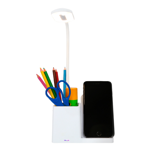 FRANKLIN Lámpara para escritorio con multiorganizador y cargador wireless para smartphones. Compatible con smartphones con tecnología Qi. Potencia de salida de máximo 15W. Incluye cable de carga.