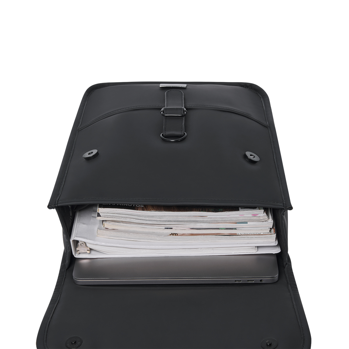 MOCHILA CADERNO - Bolsa principal con cerrado de broches magnéticos y gancho con correa ajustable. Compartimento interior acolchado para laptop de 14". Cierre invisible para acceder o remover fácilmente placa metálica. Tirantes ajustables. Incluye placa metálica para grabado láser.