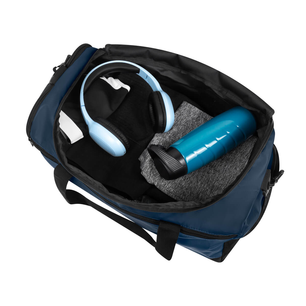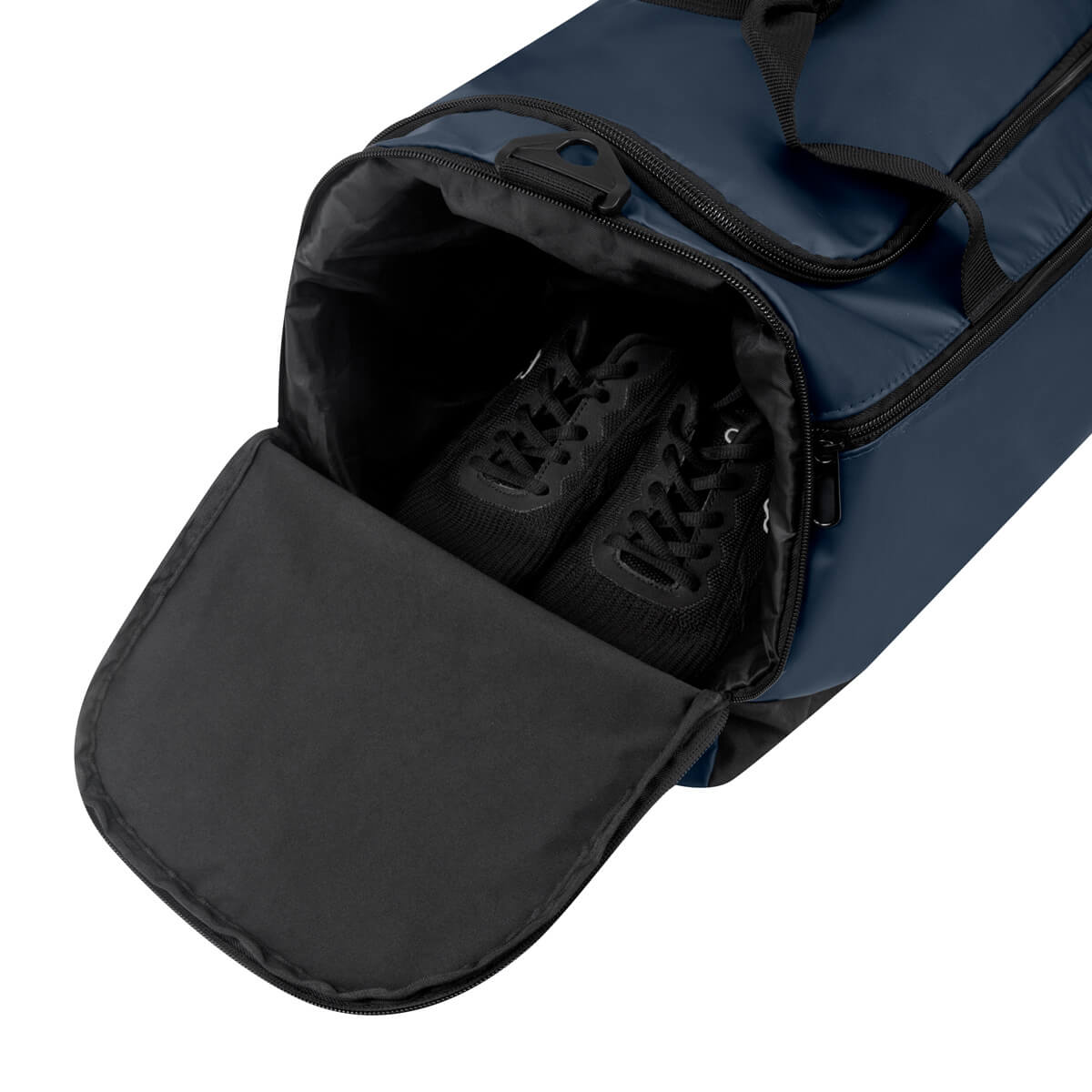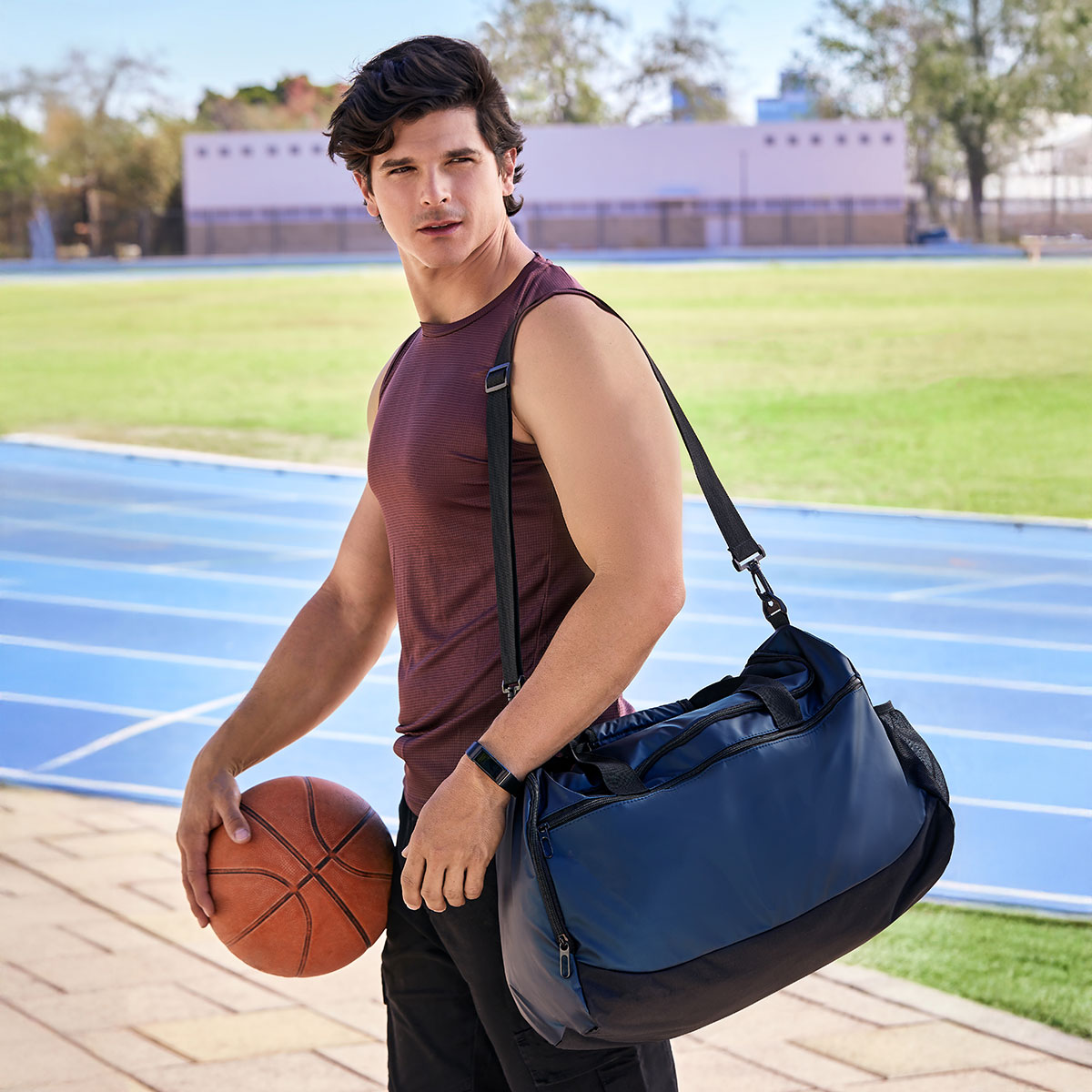 MALETA IBAWI - Práctica maleta con amplio compartimento principal y un bolsillo frontal con cierre. Cuenta con un compartimento lateral para calzado y un bolsillo lateral de malla para objetos pequeños. Incluye correa ajustable para hombro con broches de plástico removibles y asas de agarre superior. Perfecta para uso deportivo o viajes cortos