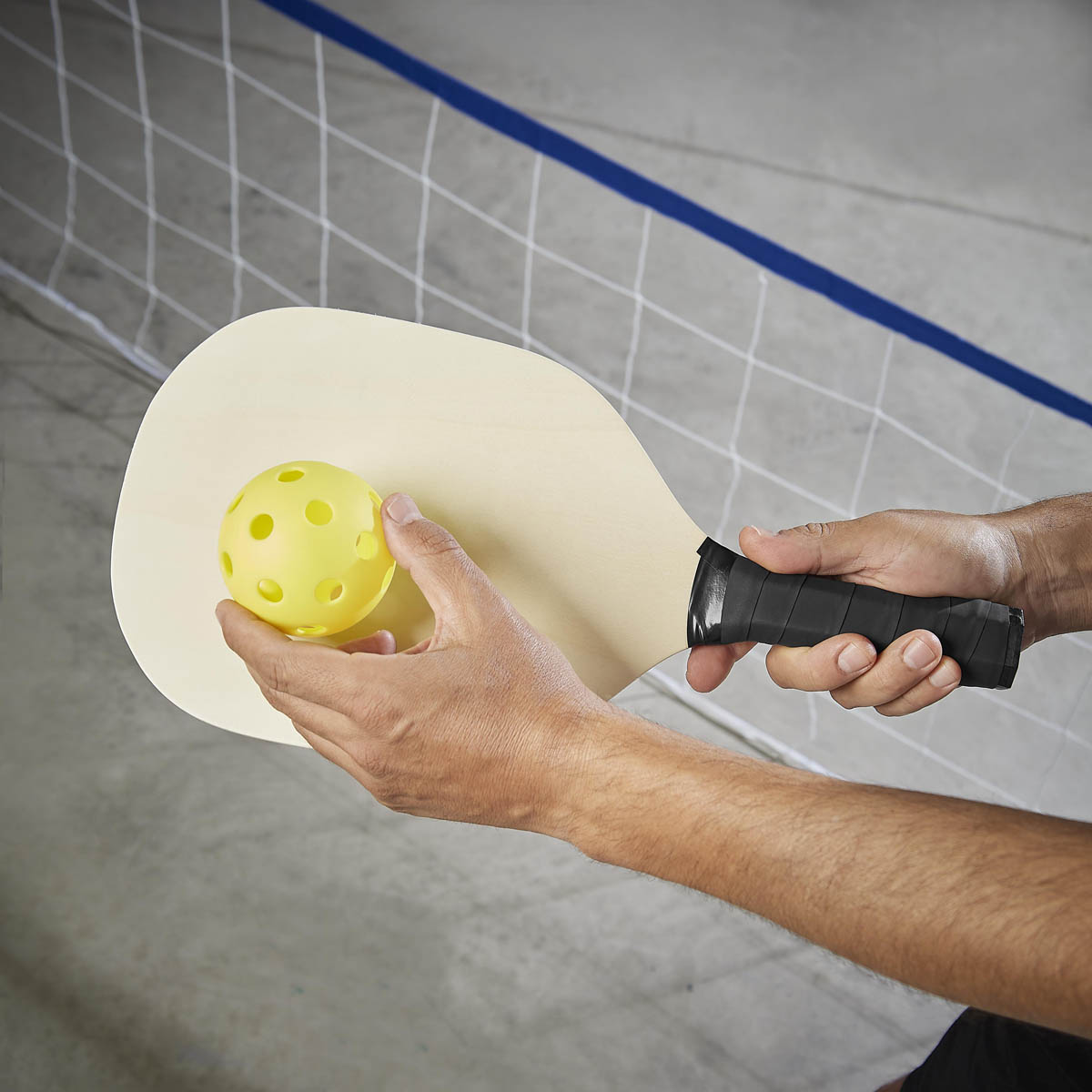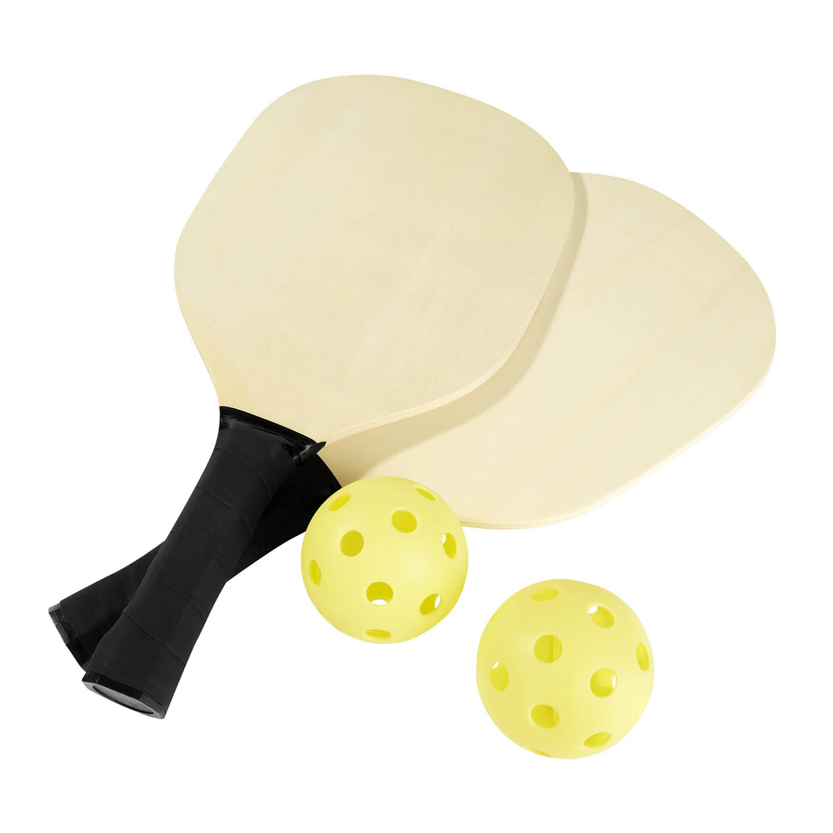 SET DE RAQUETAS ZANE - Set de raquetas para pickleball. Incluye dos raquetas de madera con mango ergonómico, dos pelotas de plástico y bolsa con malla para transportar. Este set es ideal tanto para los que buscan disfrutar del deporte en cualquier lugar.