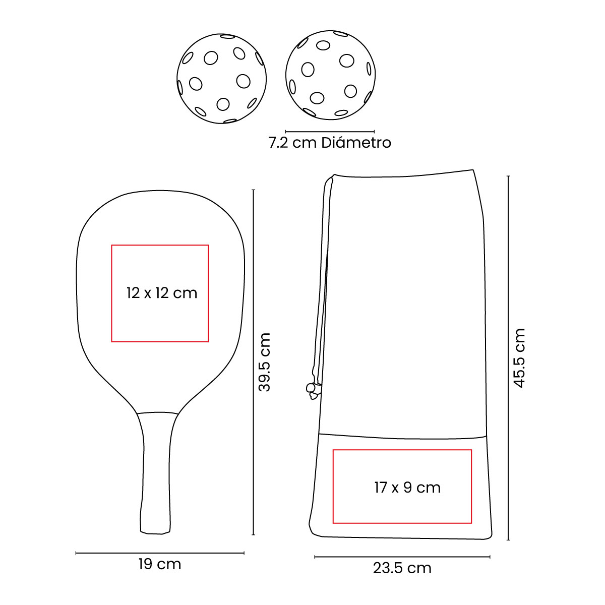 MATERIAL: Madera / Plástico / Poliéster MEDIDAS: 19 x 39.5 cm Raqueta / 7.2 cm Diámetro Pelotas / 23.5 x 45.5 cm Bolsa IMPRESION: Serigrafía MED. EMPAQUE: 60 x 41.5 x 20 cm PESO EMPAQUE: 1 Kg PIEZAS EMPAQUE: 12