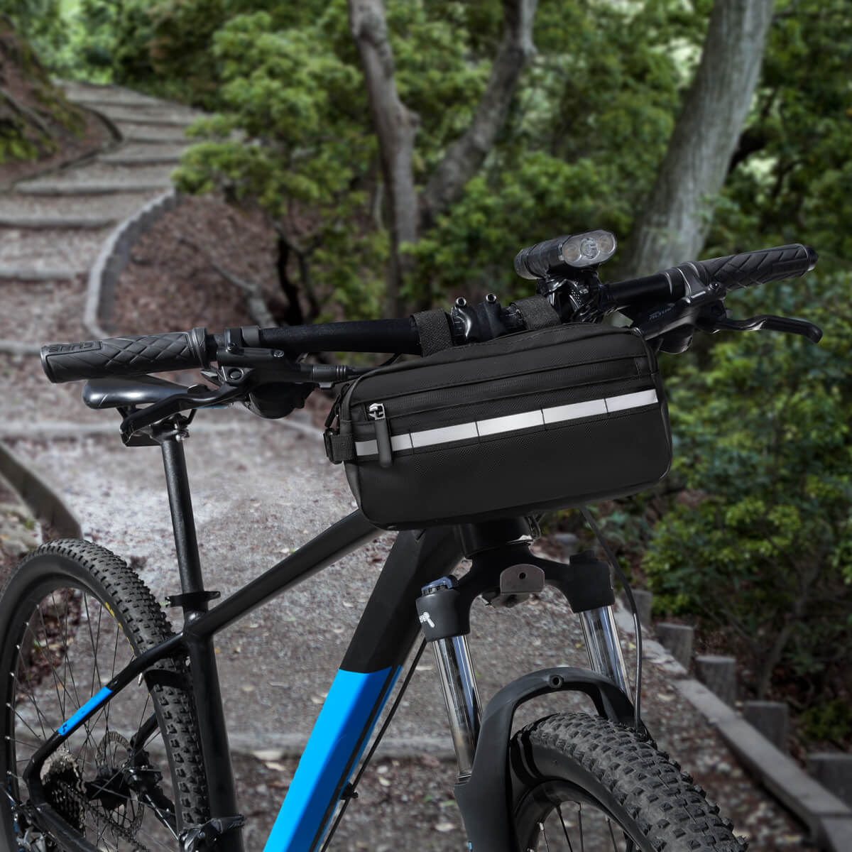 BOLSA PARA BICICLETA DRAUGS - Bolsa multifuncional para bicicleta y resistente al agua, diseñada para un estilo de vida activo. Se adapta fácilmente al cuadro de tu bicicleta o puede usarse como bolsa crossbody para mayor versatilidad. Ofrece almacenamiento práctico con un bolsillo frontal y un compartimento principal espacioso con bolsillos internos para organizar tus objetos esenciales. Su banda reflejante mejora la seguridad en trayectos nocturnos o con poca luz.