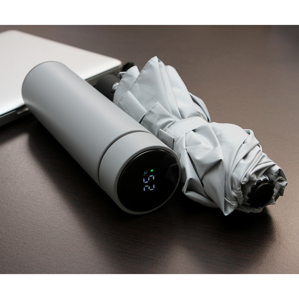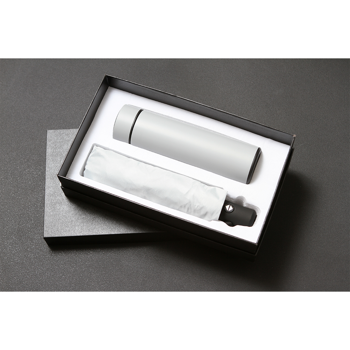 Set de regalo Jor. - Set de regalo con paraguas de poliéster con apertura automática y termo inteligente de acero inoxidable doble pared; con pantalla LED indicadora de temperatura interior en la tapa. Fabricado en materiales de grado alimenticio, mantiene bebidas frías o calientes por un largo tiempo. La batería dura hasta 2 años. No usar en microondas. Capacidad de 500 ml. Incluye caja de cartón. Cuenta con protección UV.