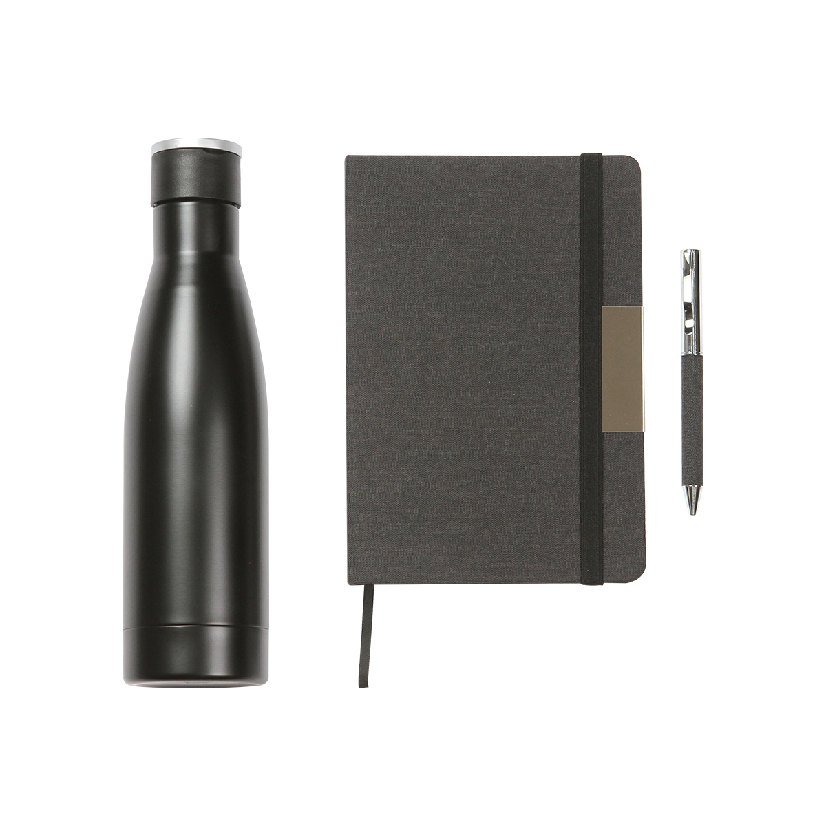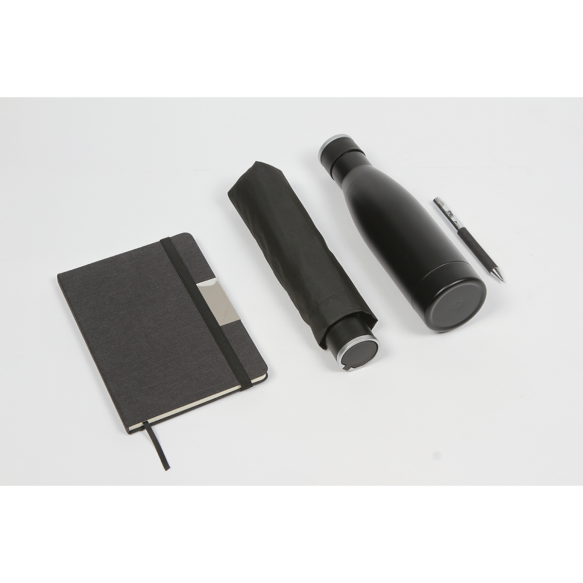 Set Kerns. - Set ejecutivo, incluye paraguas, termo de doble pared fabricado en acero inoxidable con capacidad de 500 ml. Bolígrafo con barril fabricado en latón y acero inoxidable con detalles en tela de PET reciclado, tinta de escritura azul. Libreta tamaño A5 con cubierta fabricada en PET reciclado con 80 hojas de 70g. Incluye caja de regalo negra.