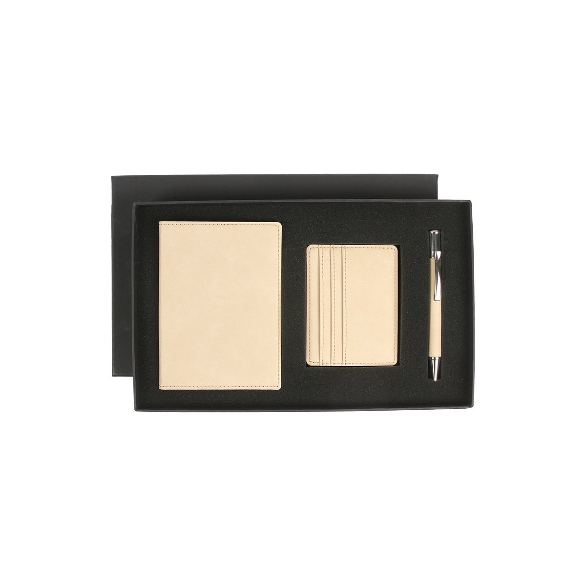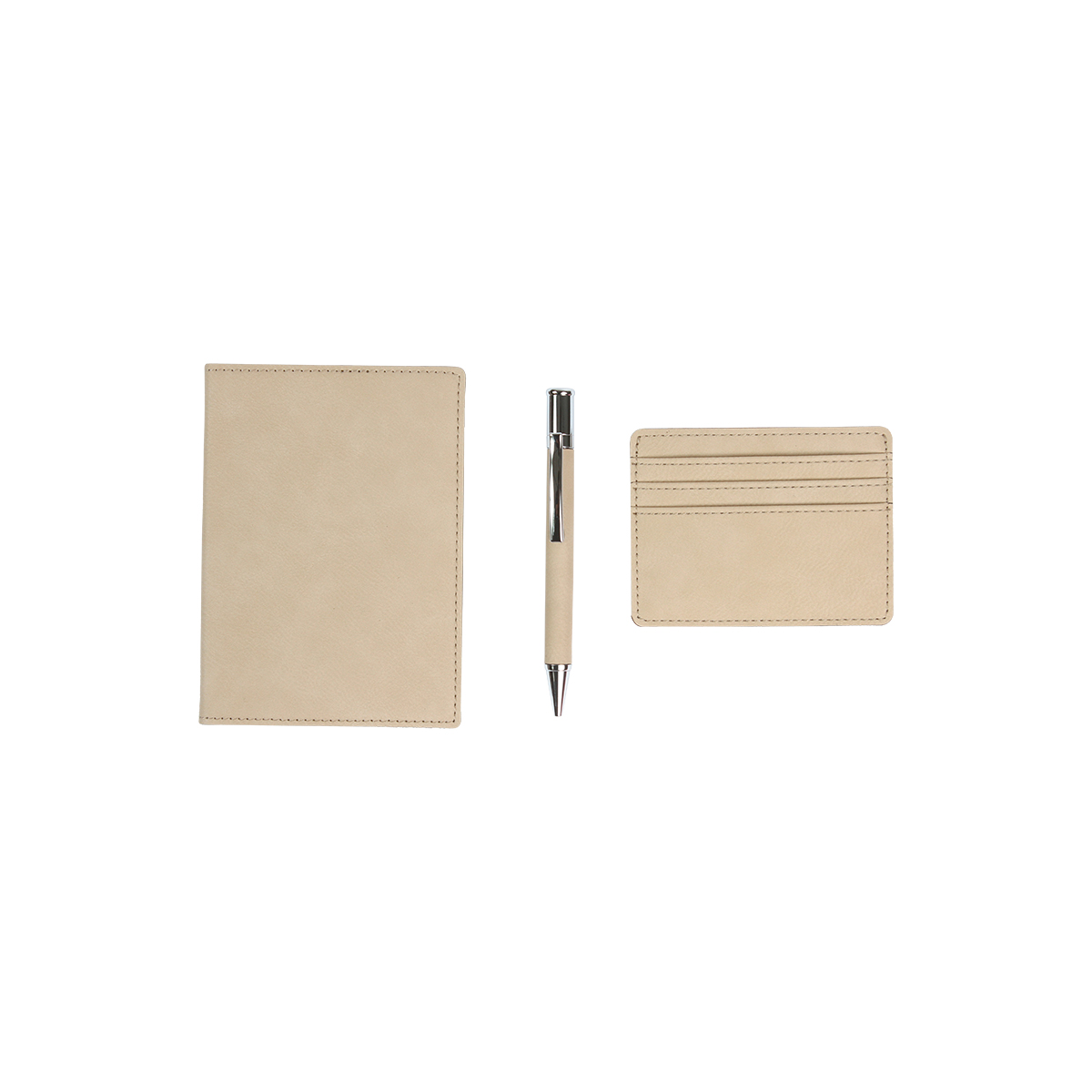 MEDIDAS: Porta pasaporte: 14x10.5x0.6 cm. | Bolígrafo: 13x1 cm. | Tarjetero: 10x7x0.3 cm. MED. EMPAQUE: 62x40x44 PIEZAS EMPAQUE: 40