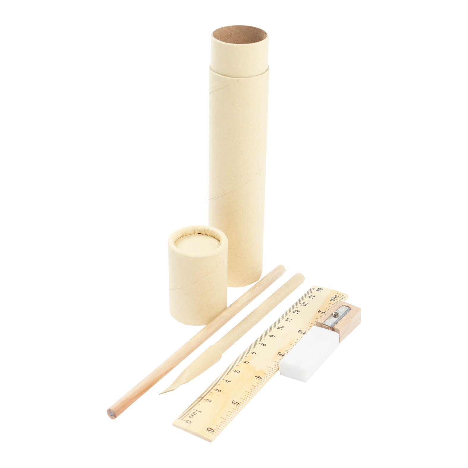 TONE Juego escolar de cartón que incluye 1 lápiz, 1 bolígrafo, 1 sacapuntas, 1 goma y 1 regla de 15 cm.
