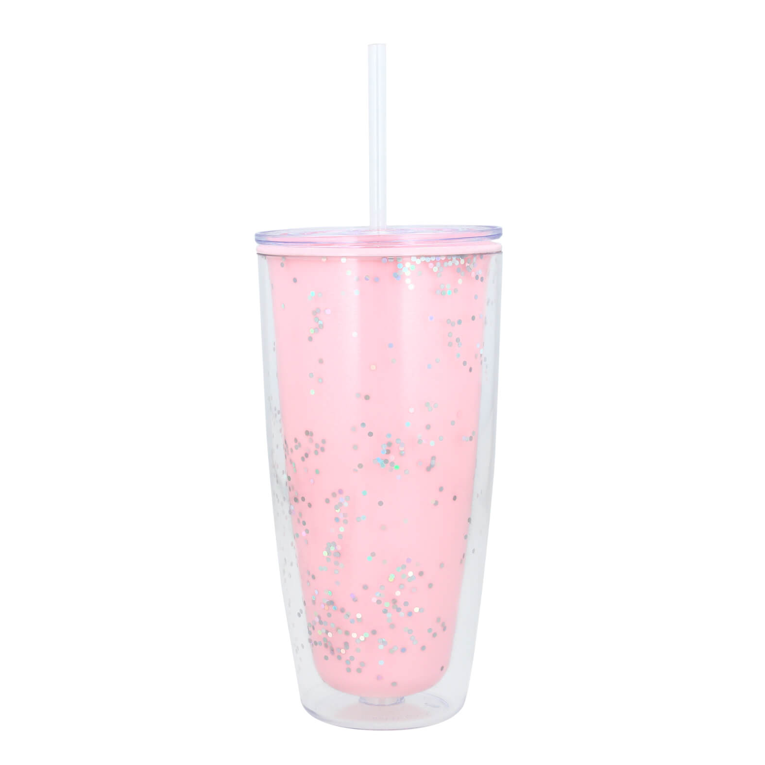 KIELER Vaso con doble pared de plástico, tapa enroscable y popote.