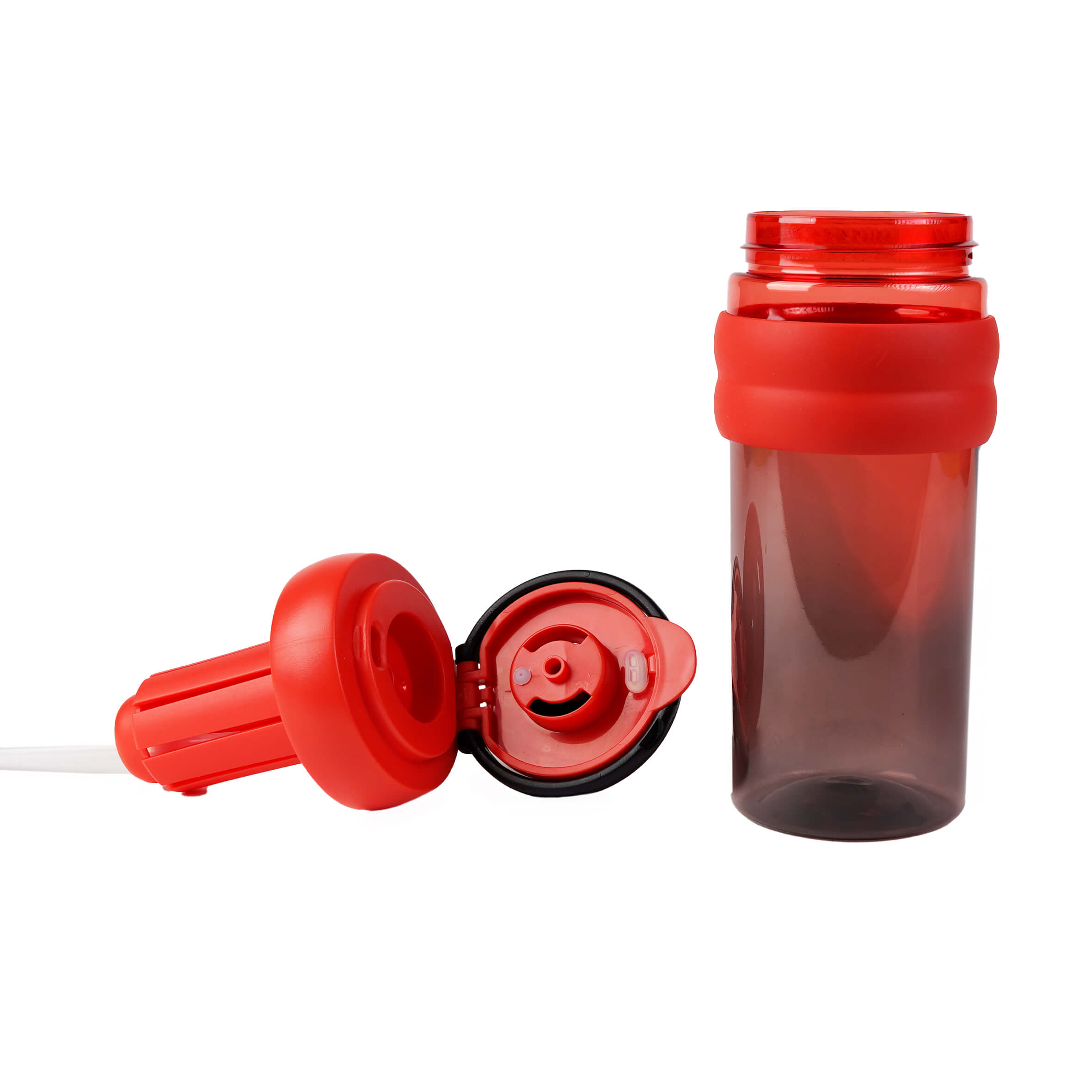 TOBA Cilindro de plástico con tapa enroscable y manga de silicón. La tapa cuenta con infusor de frutas, se puede abrir para tomar directamente, además de boquilla con popote.
