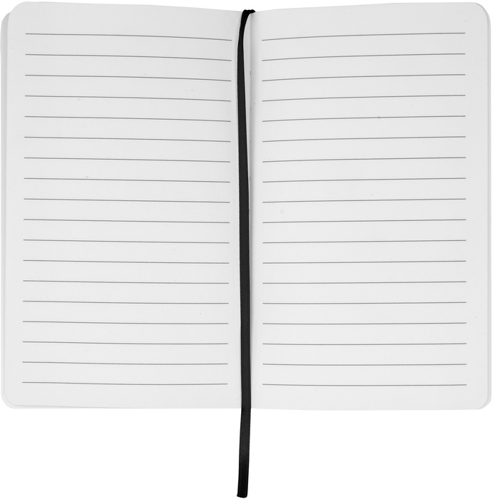 LIBRETA PEQUEÑA “WHITE” Libreta de pasta dura color blanco. Contiene 80 hojas rayadas, separador de tela. Cierra con banda elástica de color.