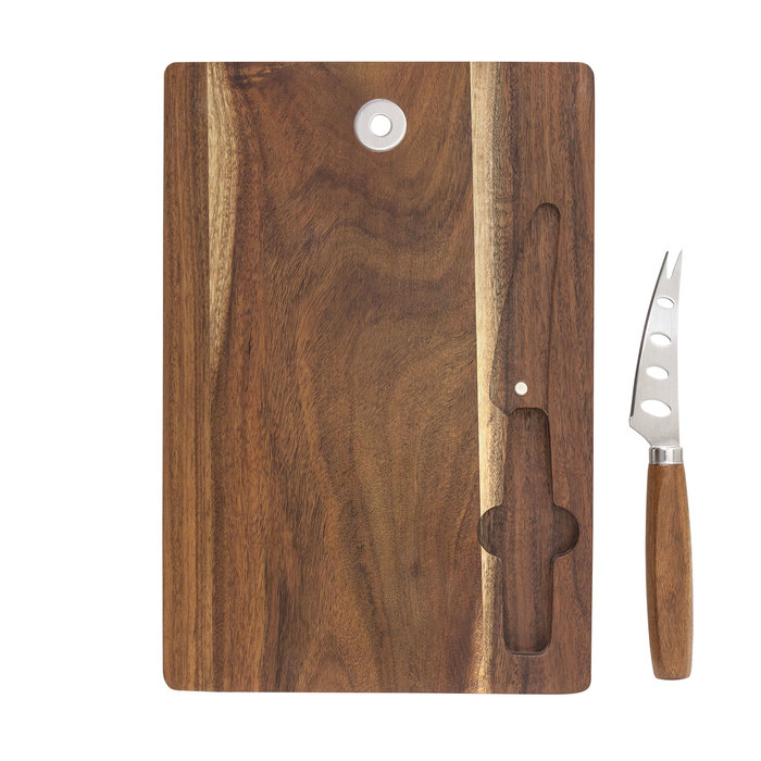 Tabla para quesos "EMMENTAL" Tabla para quesos. Tabla de madera de acacia con imán para fijar el cuchillo y anillo de acero inoxidable para colgar. Cuchillo con agujeros ideal para quesos blandos a semiduros, de 17,2 cm., hoja de acero inoxidable 420 y mango de madera de acacia. Presentación en caja de regalo kraft.