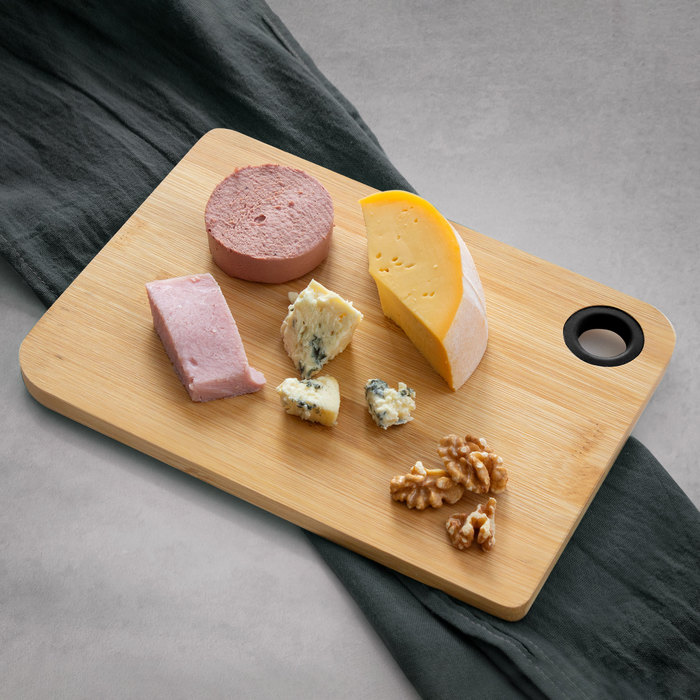 Tabla de corte "GOUDA" Tabla de bambú con anillo de silicona color negro para colgar y trasladar. Tabla para cortar y presentar diferentes quesos, fiambres y embutidos. Presentación en caja de regalo kraft.