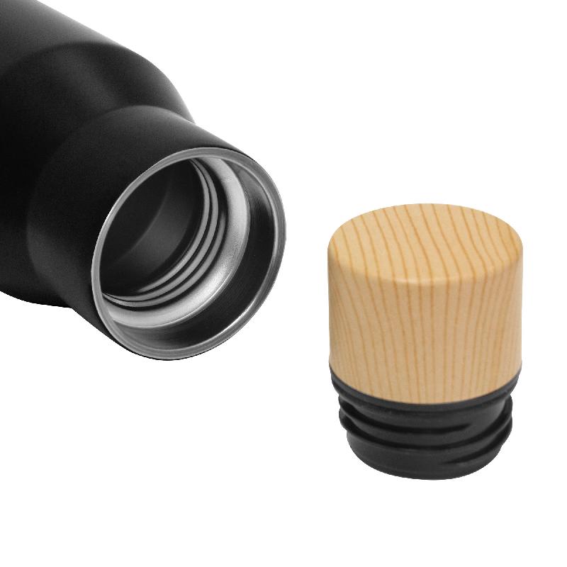 Botella térmica "DORICA" Capacidad 500 ml. Botella doble pared, sellada al vacío. Interior de acero 304 y exterior de acero 201. Pintura acabado mate. Tapa a rosca con anillo de silicona, interior de acero 201 y exterior en PP imitación bambú. Mantiene por más de 12 hs la temperatura de las bebidas calientes y 24 hs de las bebidas frías. Presentación en caja de regalo kraft.
