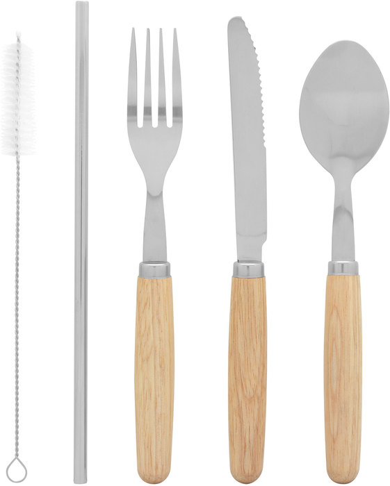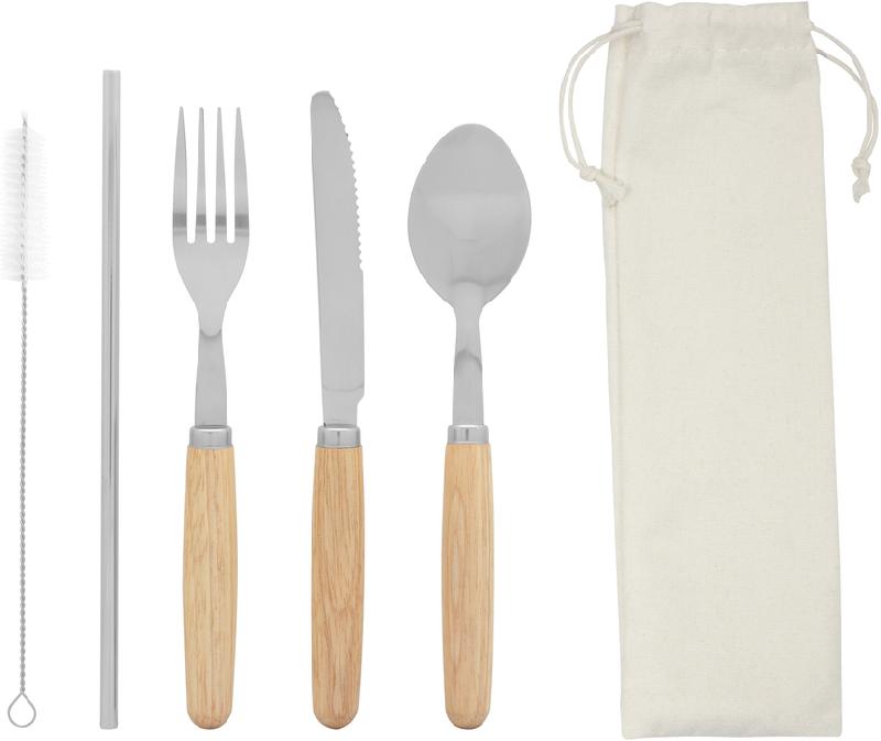 SET DE CUBIERTOS "MEALTIME" Set de cubiertos. 5 elementos: Popote, cepillo para popote, cuchara, tenedor y cuchillo. Mango de madera para los 3 cubiertos. Todo el set está contenido en un estuche de lona color crudo. Presentación en caja de regalo Kraft.