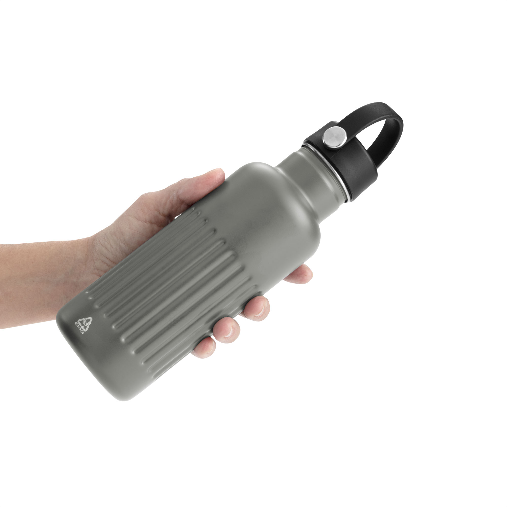 Botella térmica "KAWA" Botella doble pared, sellada al vacío. Botella con aislamiento térmico. Tecnología vacuum. Interior de acero 304 reciclado y exterior de acero 201. Tapa a rosca de polipropileno, interior plástico. Asa reforzada de silicona. Pintura acabado semi mate. Cuerpo texturado para un mejor agarre. Mantiene hasta 8 hs la temperatura de las bebidas calientes y hasta 12 hs la de las bebidas frías