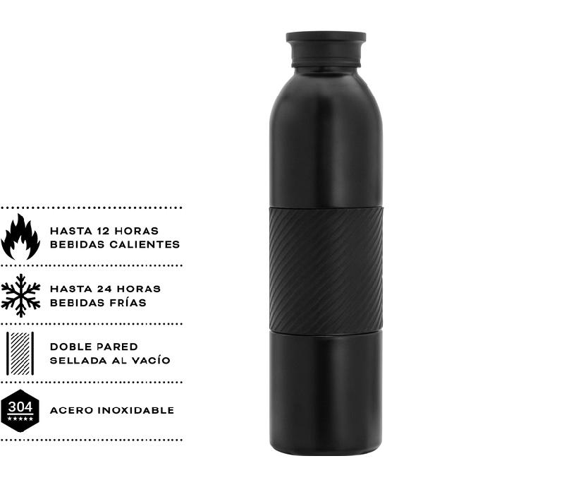 Botella térmica "GRIP" Botella doble pared, sellada al vacío. Interior en acero 304 y exterior en acero 201. Grip de silicona texturado para mejor agarre. Pintura acabado mate. Tapa de polipropileno y acero inoxidable 201. Presentación en caja de regalo kraft.