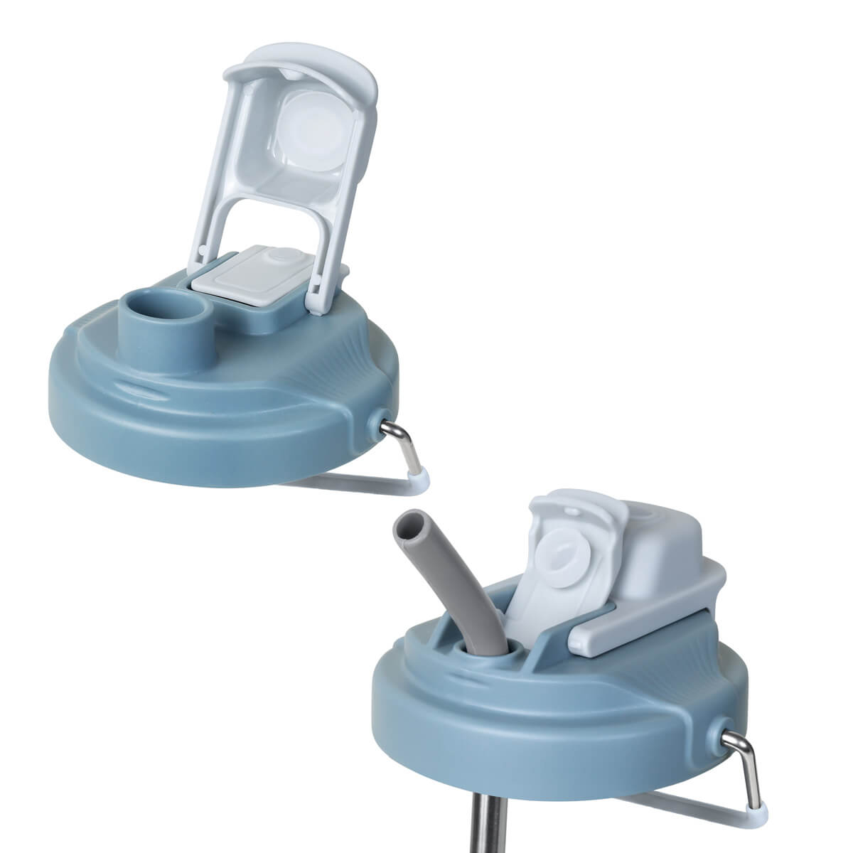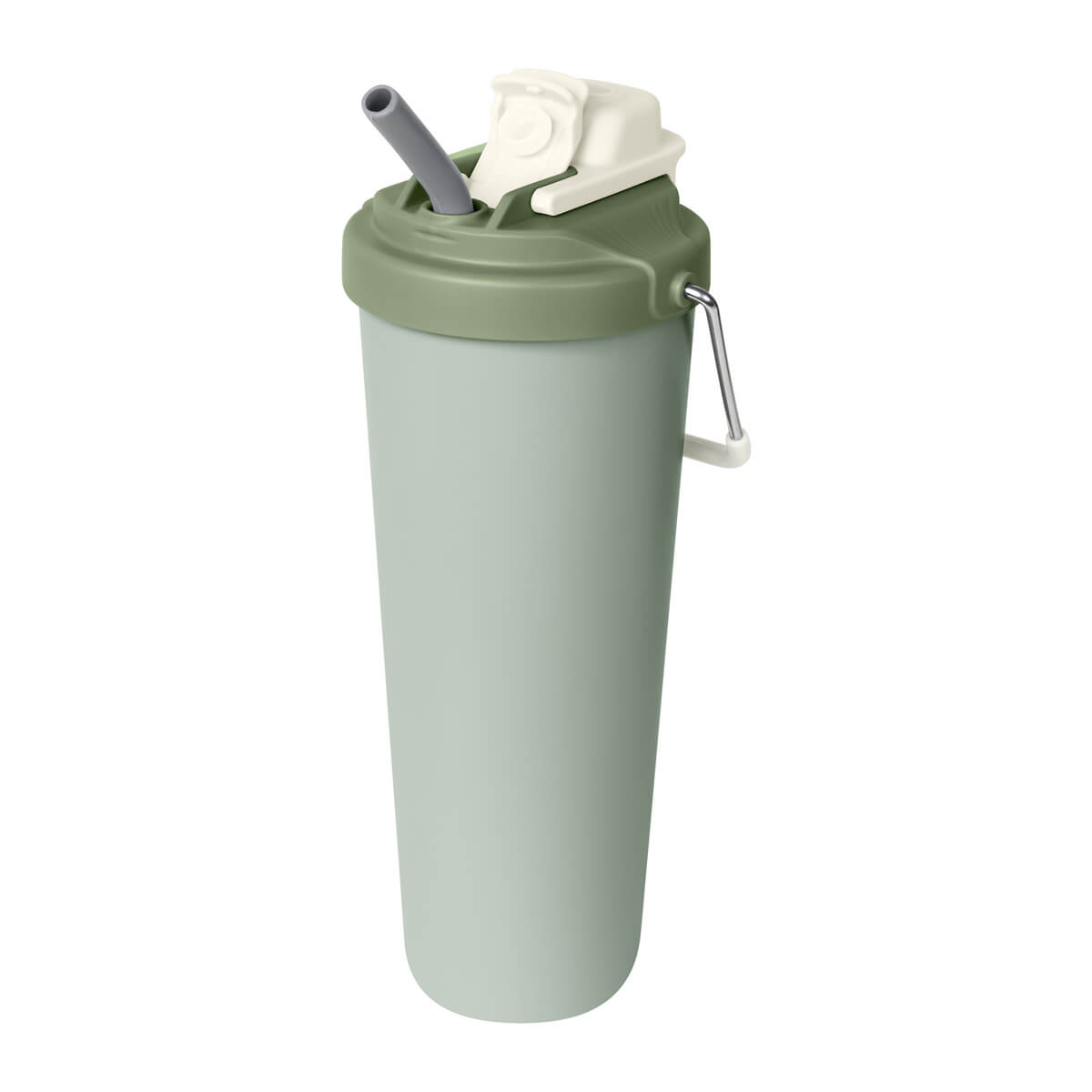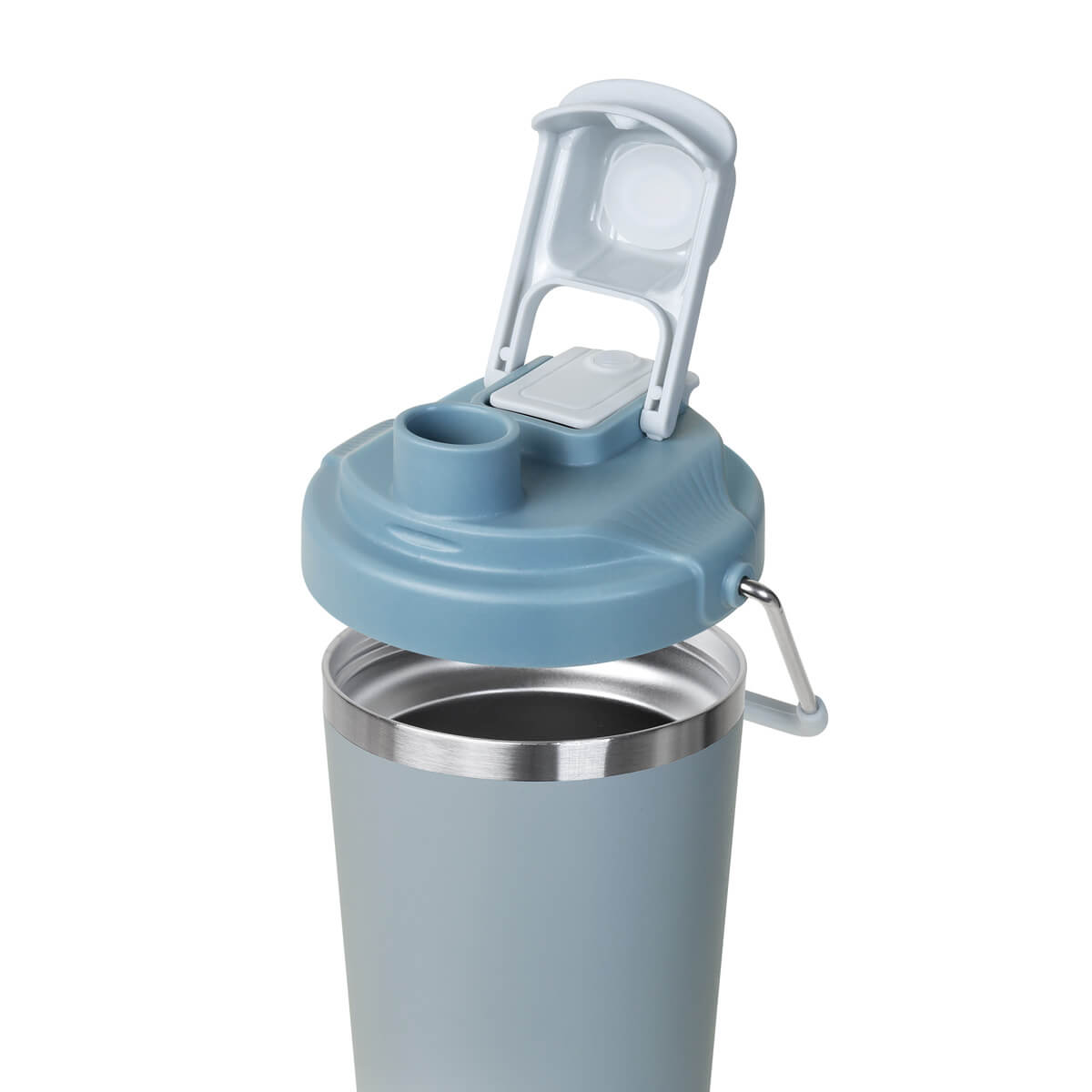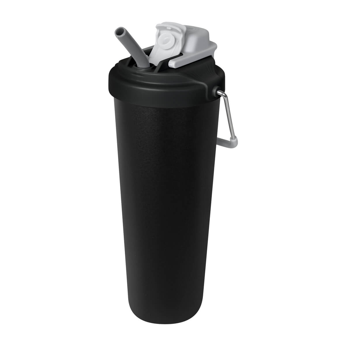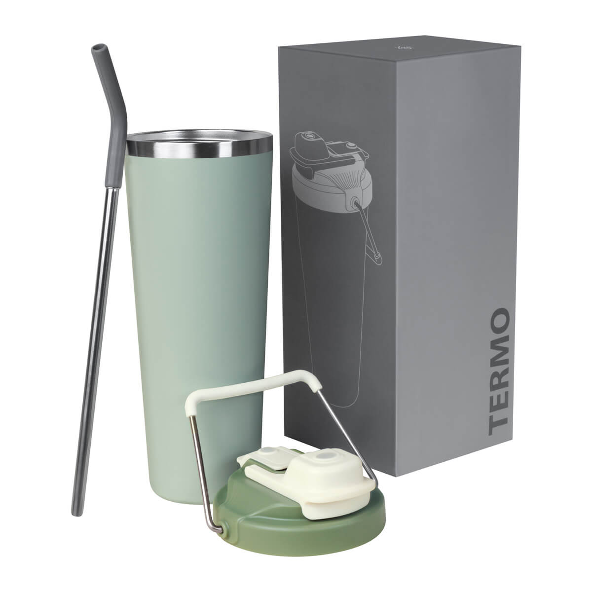 TERMO KRUNA - Termo doble pared. Cerrado al vacío. Pared interna y externa acero inoxidable. Cuerpo con terminado rugoso. Tapa de plástico con sistema de rosca y doble sobretapa con cierre push, una con boquilla para beber y otra con ranura para popote. Agrega un asa metálica con recubrimiento de silicón para llevarlo contigo a todos lados. Mantiene la temperatura caliente por 4 hrs y la temperatura fría por 8 hrs. Capacidad de 25 Oz. Base de 7 cm de diámetro. Incluye caja individual.