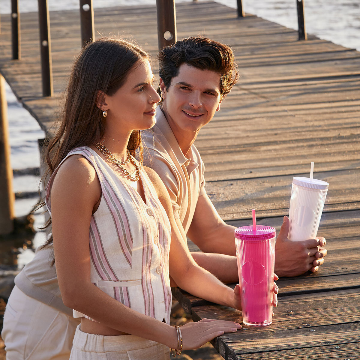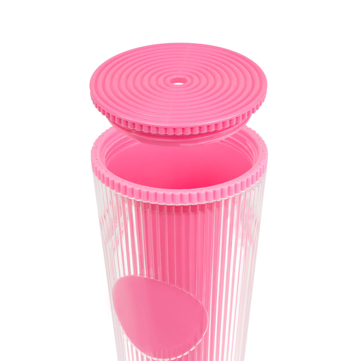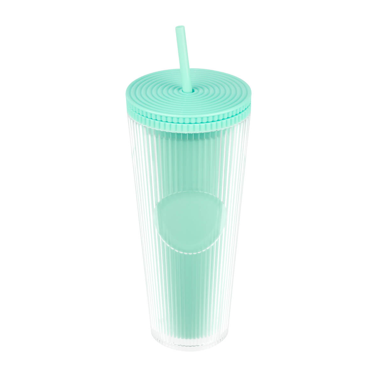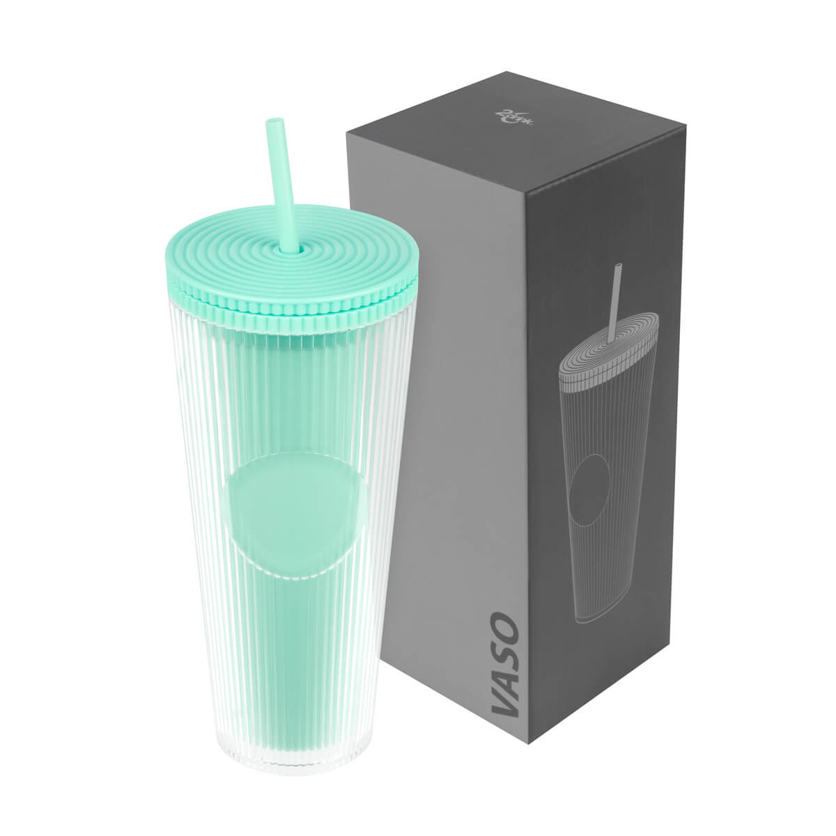 VASO VIIVA - Vaso doble pared. Pared interna y externa de plástico. Tapa de rosca y ranura para popote. Diseñado moderno de acabado texturizado, con líneas en relieve le dan un toque único y moderno. Ideal para oficina, escuela o para disfrutar de tus bebidas mientras viajas. Capacidad de 24 Oz. Base de 7 cm de diámetro. Incluye popote de plástico y caja individual.