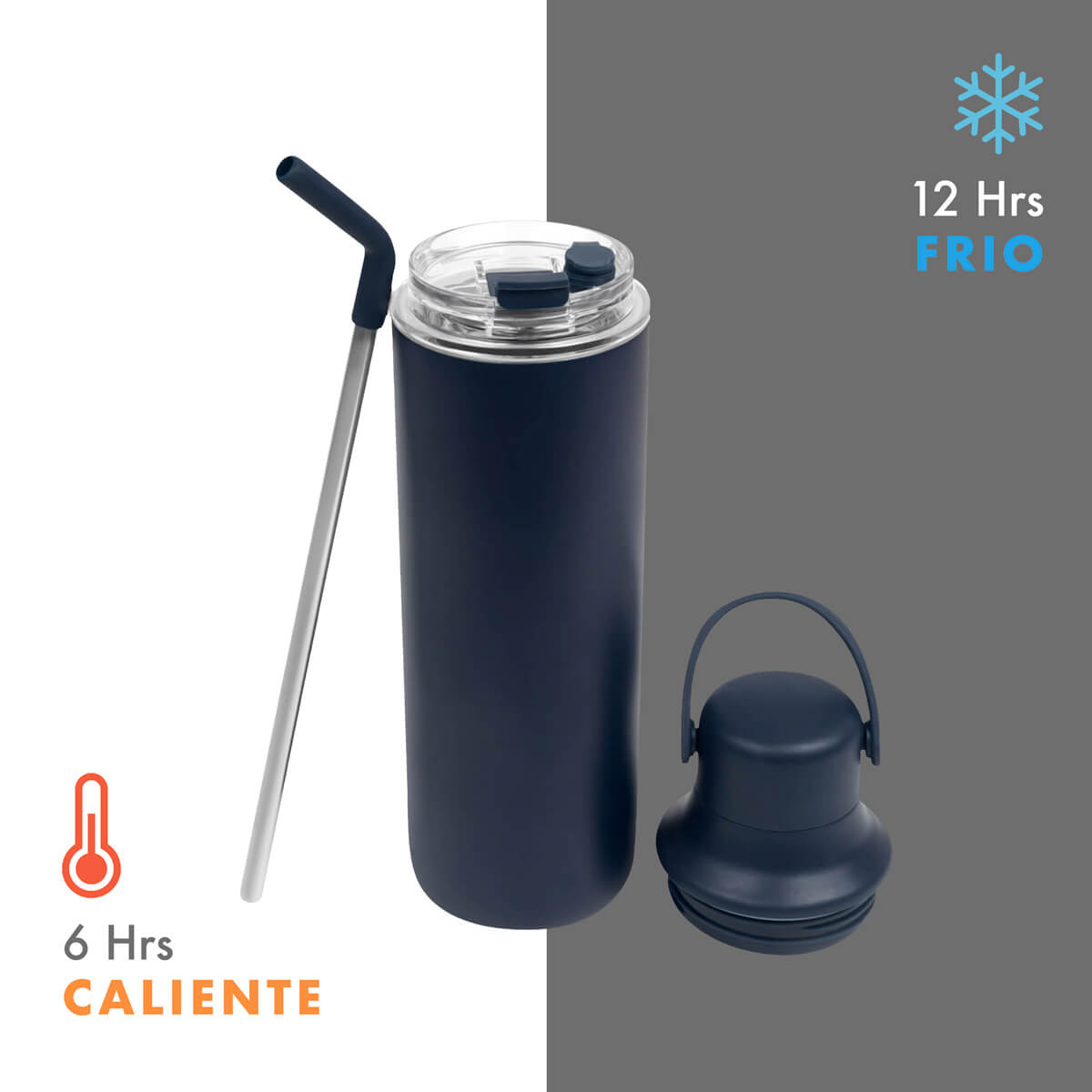 SET DE TERMO DACIO - Original set de termo con tapas intercambiables. Incluye termo doble pared, cerrado al vacío. Pared interna y externa de acero inoxidable. Cuerpo con terminado rugoso que permite tener un mejor agarre. Cuenta con una tapa de plástico con doble sistema de rosca, la más amplia permite introducir hielos y otros ingredientes, mientras que su segunda rosca, incluye una boquilla pequeña, que facilita su uso. Su segunda tapa, también con sistema de rosca, incluye una sobre tapa tipo push y ranura especial para popote. Mantiene temperatura caliente 6 hrs y temperatura fría 12 hrs. Capacidad 20 Oz. Incluye popote metálico con boquilla de rubber y caja de regalo.