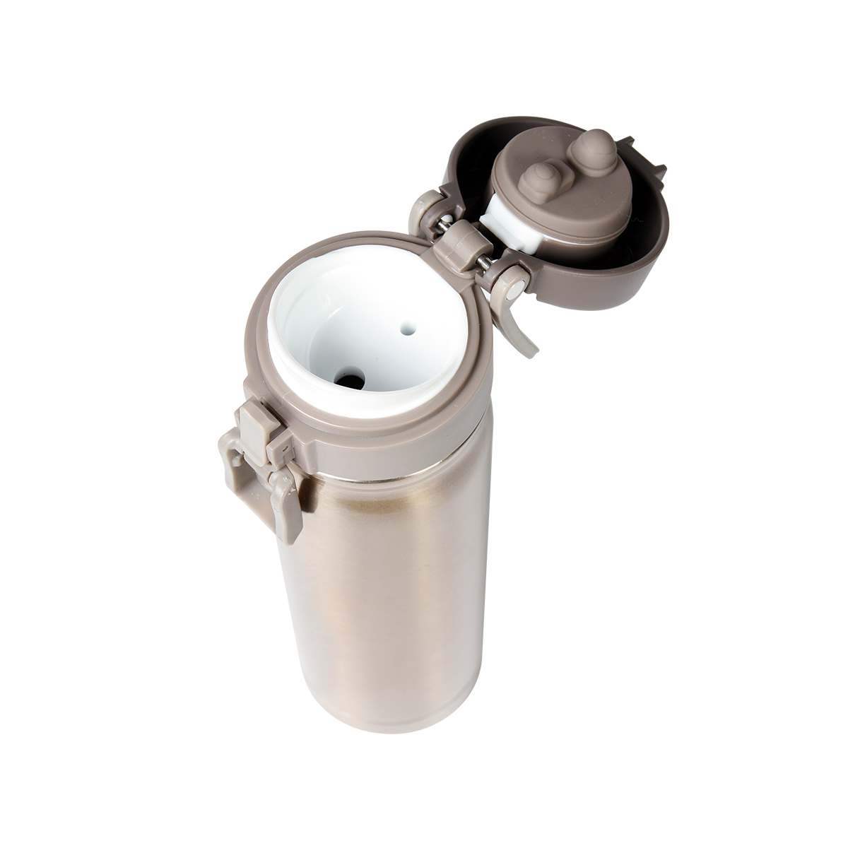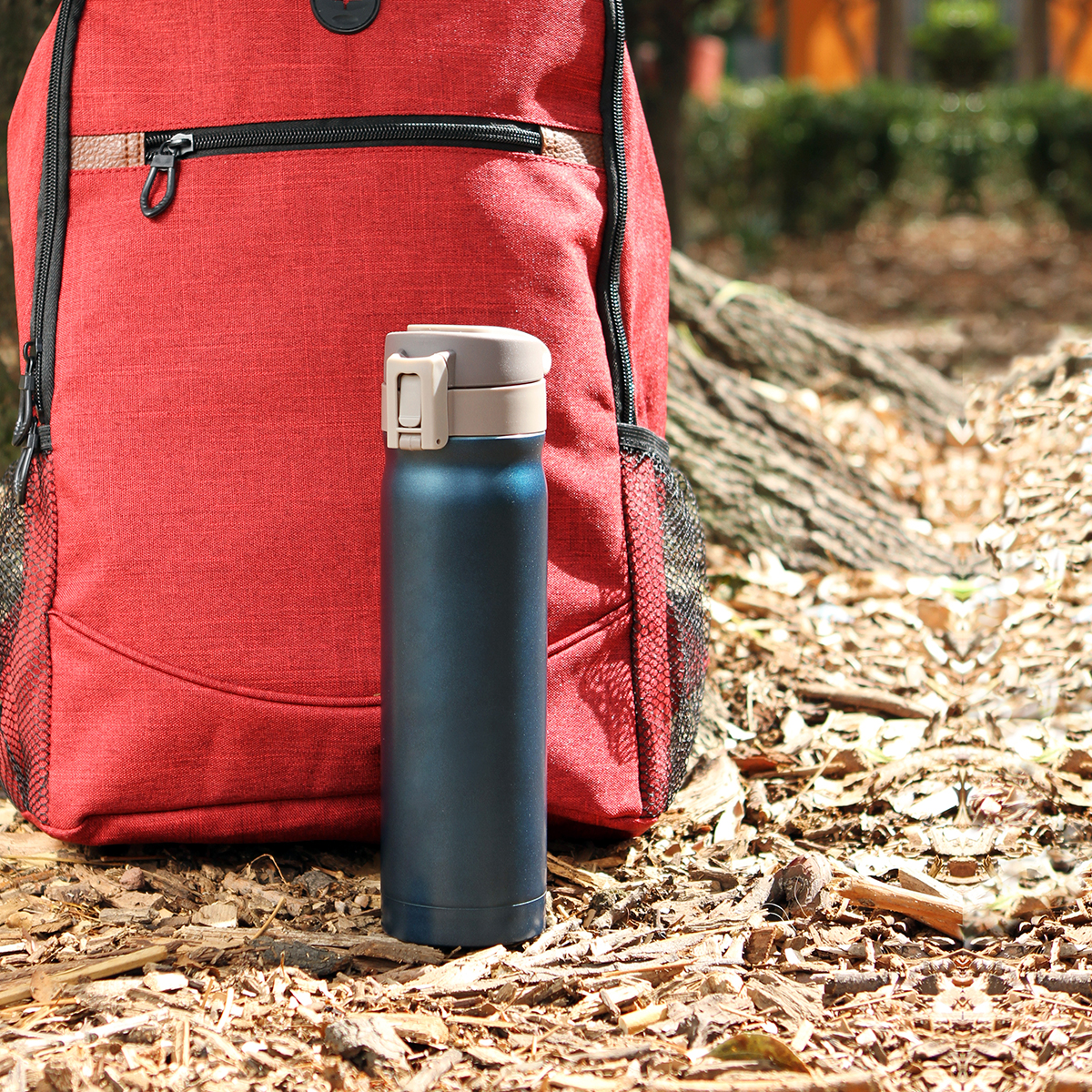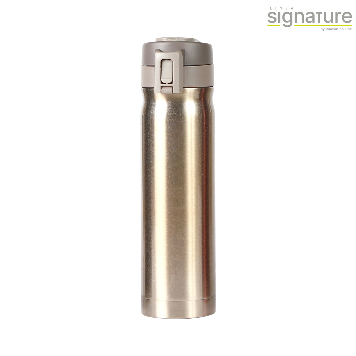 Termo Abiyán. - Termo de acero inoxidable doble pared con tapa con seguro, fabricado en materiales de grado alimenticio, mantiene bebidas frías o calientes por un largo tiempo, no usar en microondas. Capacidad de 500 ml (17 oz). Incluye caja de cartón individual.