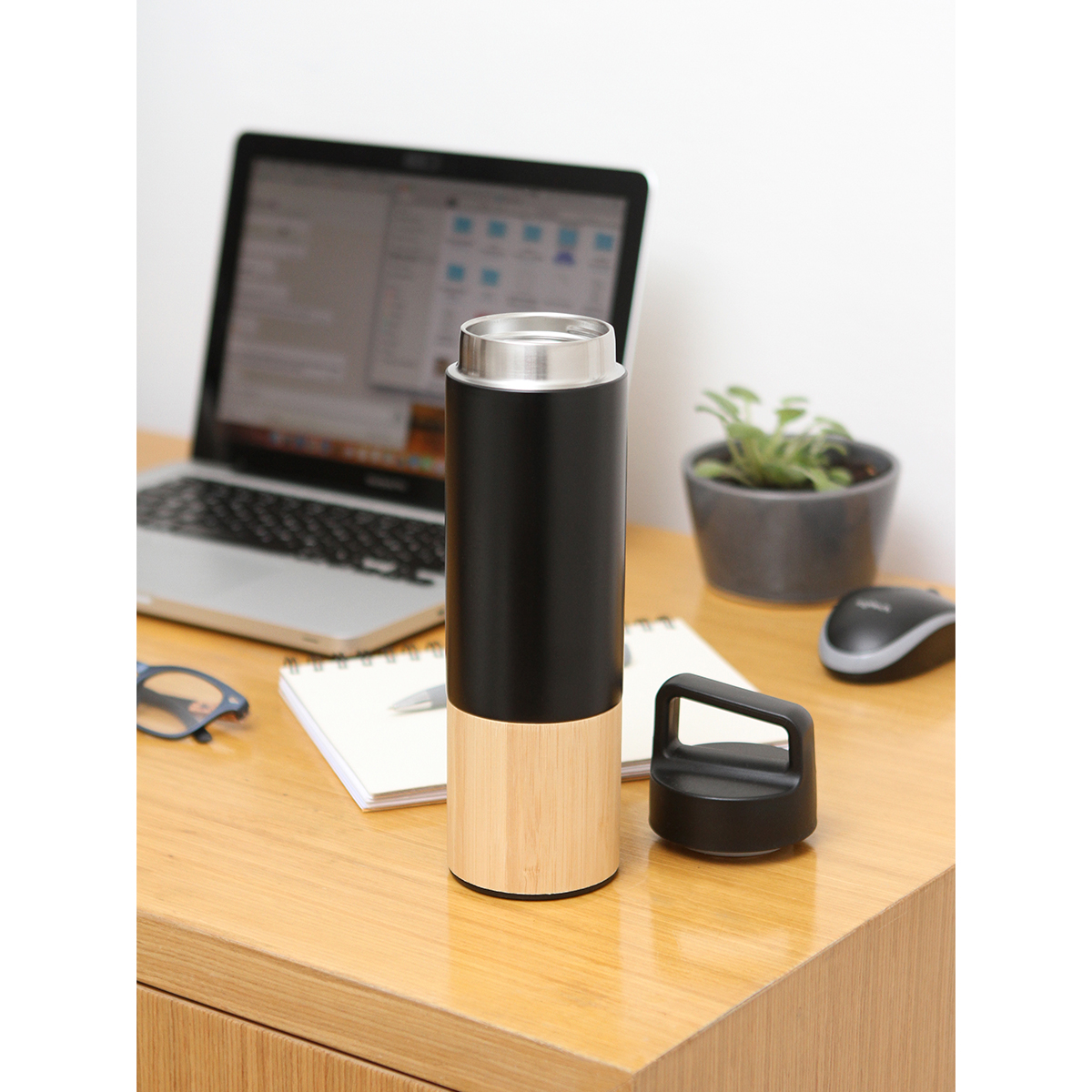 Termo Amberes. - Termo de acero inoxidable doble pared, detalle de bambú en la parte baja y tapa de plástico con agarradera. Fabricado en materiales de grado alimenticio, mantiene bebidas frías o calientes por un largo tiempo. No usar en microondas. Capacidad de 500 ml. Incluye caja de cartón individual.