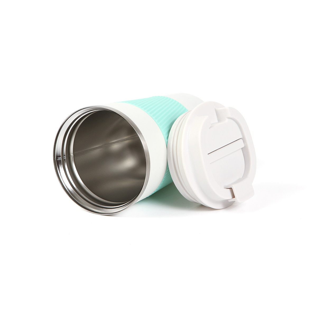 Vaso Lusail. - Vaso de acero inoxidable doble pared, tapa de plástico con boquilla y manga de silicón. Fabricado en materiales de grado alimenticio, mantiene bebidas frías o calientes por un largo tiempo. No usar en microondas. Capacidad de 510 ml. Incluye caja de cartón individual