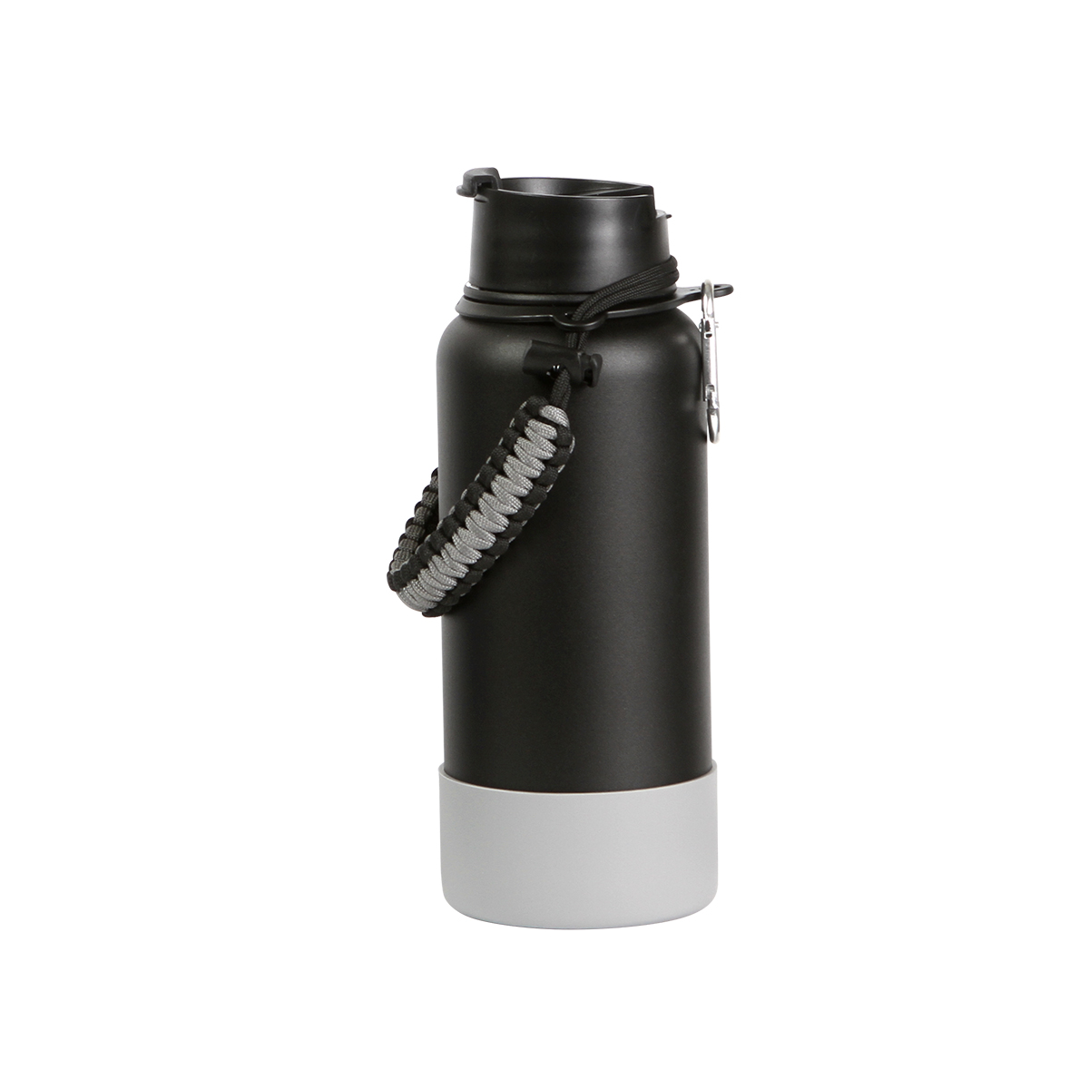 Botella Sarnen. - Botella deportiva, fabricada en acero inoxidable doble pared. Tapa de rosca con boquilla. Cuenta con capacidad de 1,000 ml. Incluye arnés, correa con detalles en gris y base de silicón anti derrapante.