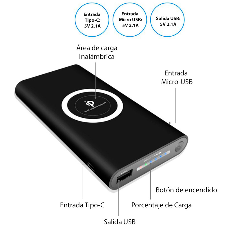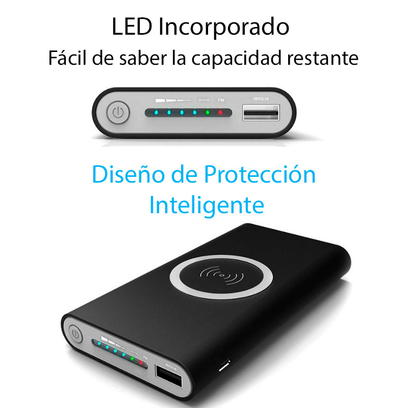 POWER BANK WIRELESS Power Bank para carga Inalámbrica y carga Convencional por cable. Soporta la carga de hasta 2 dispositivos simultáneamente. Capacidad de10,000 mAh. Cable USB tipo A y C. *Parche QI se vende por separado