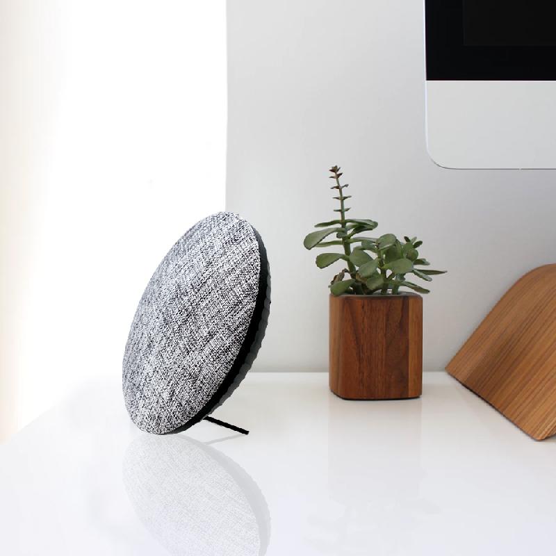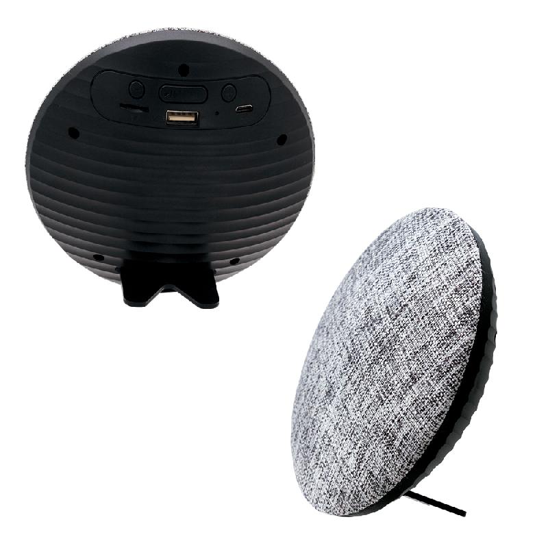 Bocina bluetooth redonda, con recubrimiento de tela y altavoz. Medidas: 12.5 x 12.5 x 5 cm Material: Plástico tela. Empaque: Caja blanca de cartón