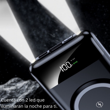 POWER BANK WIRELESS Qi 4 EN 1 10,000 mAh Power Bank Qi Inalámbrica Li-Polymer Con nuevo diseño de 4 entradas integradas. Puede cargar hasta 4 dispositivos al mismo tiempo. Ideal para utilizar en viaje o para uso familiar. Aspecto discreto y elegante. Carga de alta velocidad hasta 5W. La bateria cuenta con 6 salidas: 5V=2.1A (Micro) 5V=2.1A (Tipo-C) 5V=2.1A (Lightning) Wireless 5W 2*USB (2.1 Amperios + 2.1 Amperios) Cuando se conecte, el indicador mostrará la batería que le queda.
