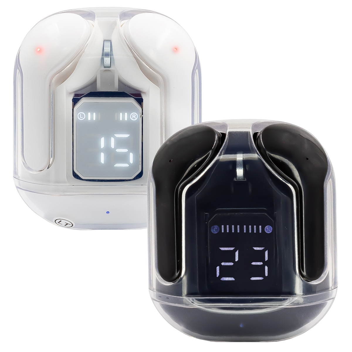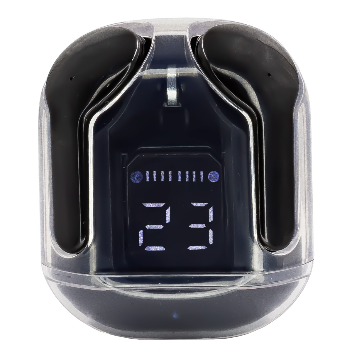 AUDÍFONOS CRISTAL Audífonos bluetooth 5.1, con sistema touch para manos libres. Sonido estéreo con procesador de alto rendimiento proporciona claridad. Especificaciones -Puerto de carga: USB tipo “C” -Capacidad batería de audífono: 30mAh -Capacidad de estación de carga: 300mAh Incluye -1 Cable USB tipo “C”