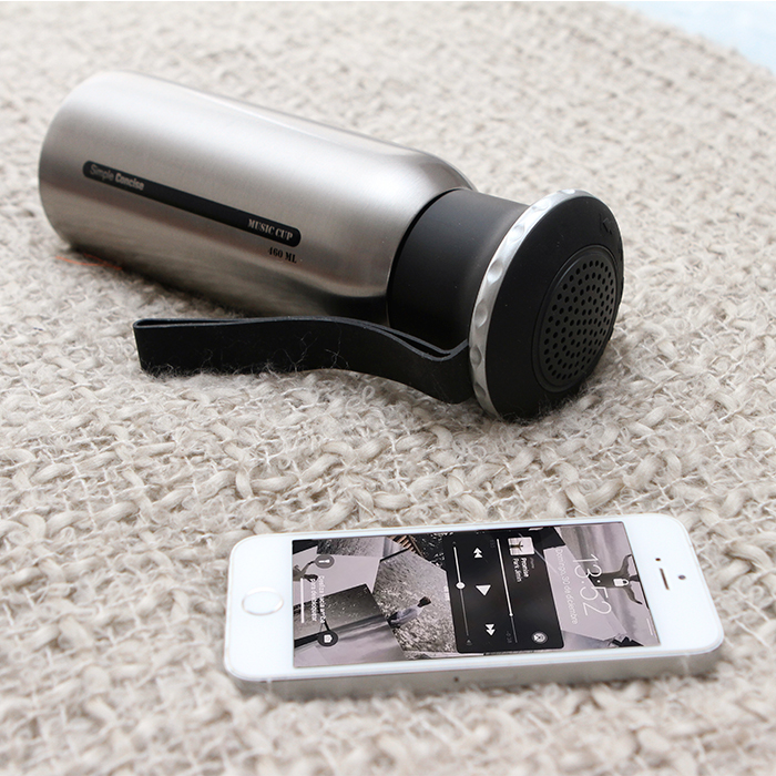 Termo con bocina Belluno. - Termo de acero inoxidable doble pared con bocina con conexión de sonido sin cables, con un alcance máximo de 9.9 M. y radio FM en la tapa , fabricado en materiales de grado alimenticio, mantiene bebidas frías o calientes por un largo tiempo, no usar en microondas. Capacidad de 460 ml (14 oz). Incluye caja de cartón individual.
