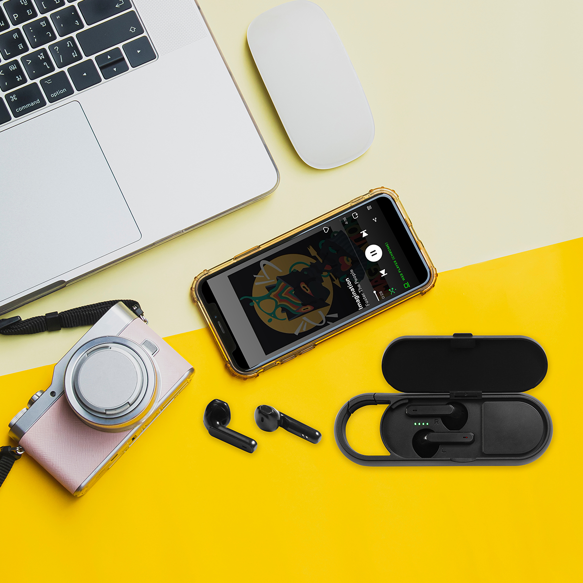 Bocina Mandera. - Bocina y auriculares con conexión de sonido sin cables, cuenta con arnés para facilitar la transportación. Carga a través de cable USB (incluido). Incluye caja de cartón individual.