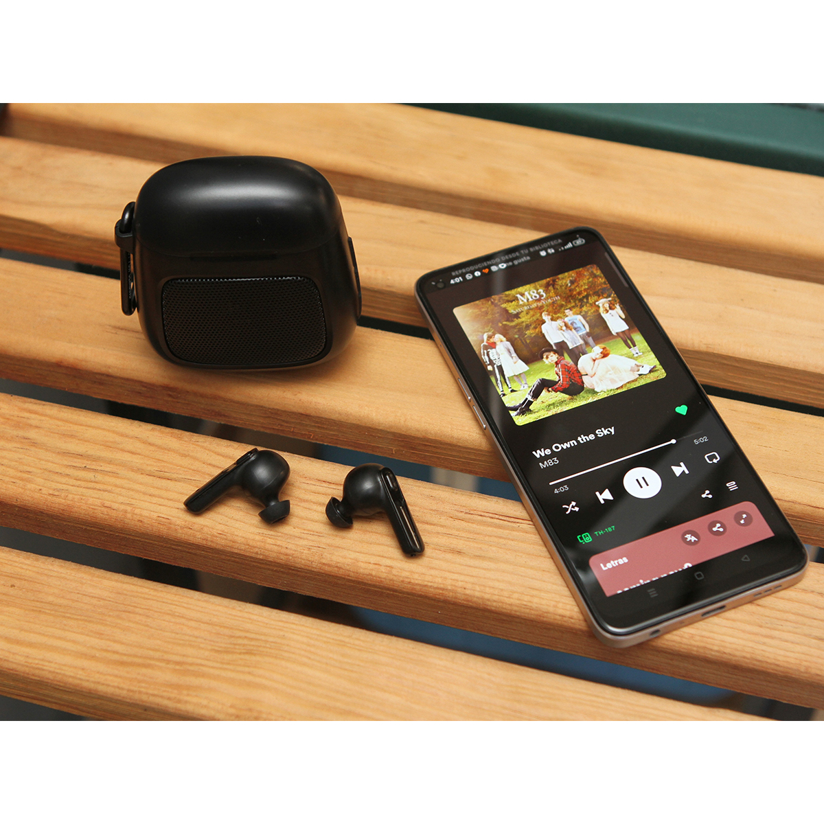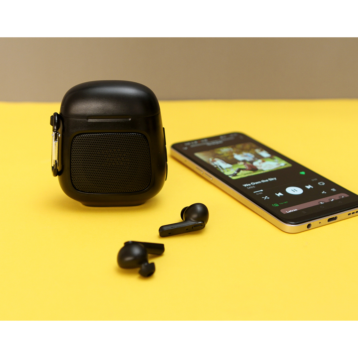 Bocina Bibbona. - Bocina  con audífonos con conexión de sonido sin cables,  fabricada en plástico, incluye arnés para fácil transporte, carga a través de cable USB (incluido). Cuenta con audífonos inalámbricos que ofrecen una experiencia auditiva privada, perfecta para aquellos momentos en que deseas disfrutar de tu música sin molestar a los demás o para mantener conversaciones telefónicas más privadas. Incluye caja de cartón individual.