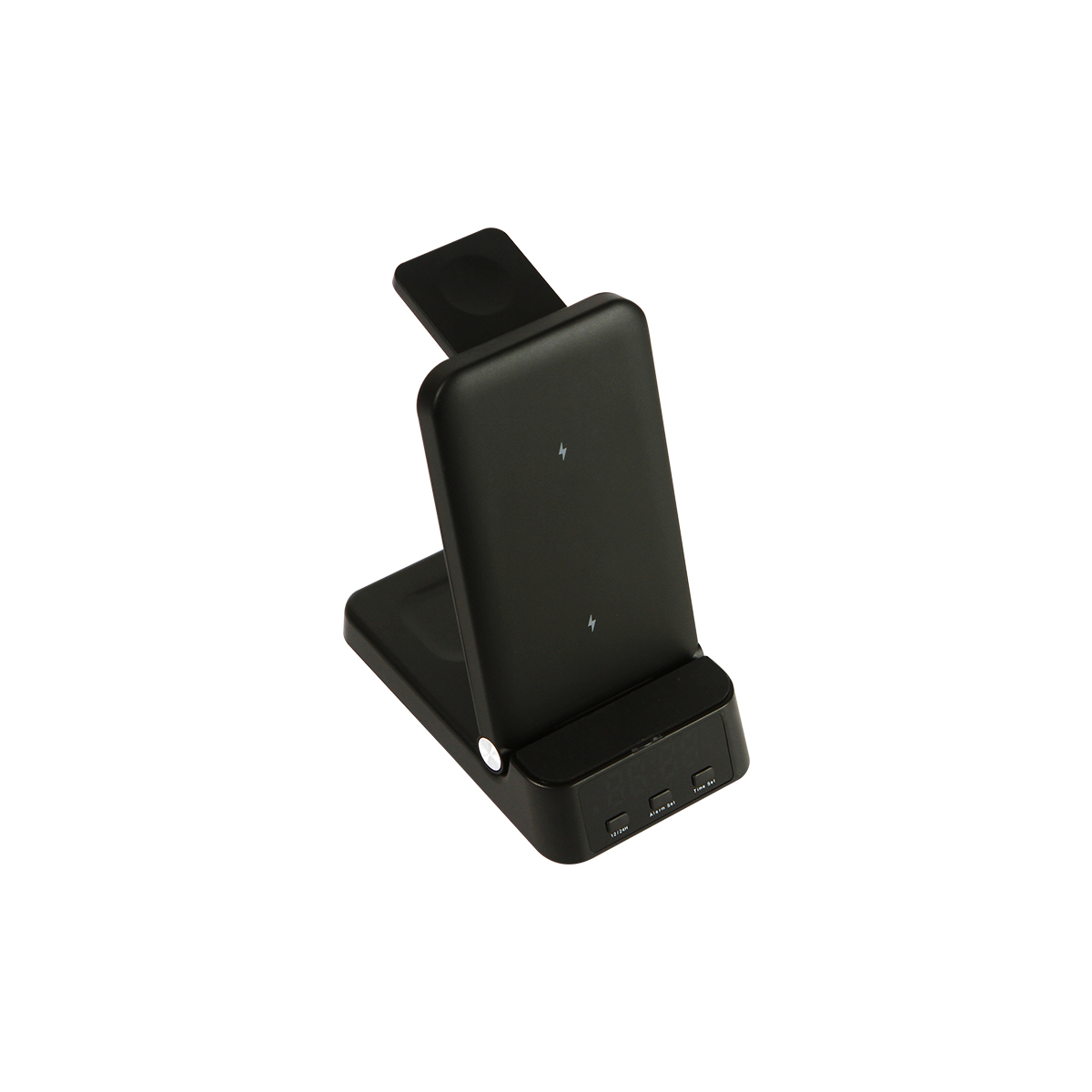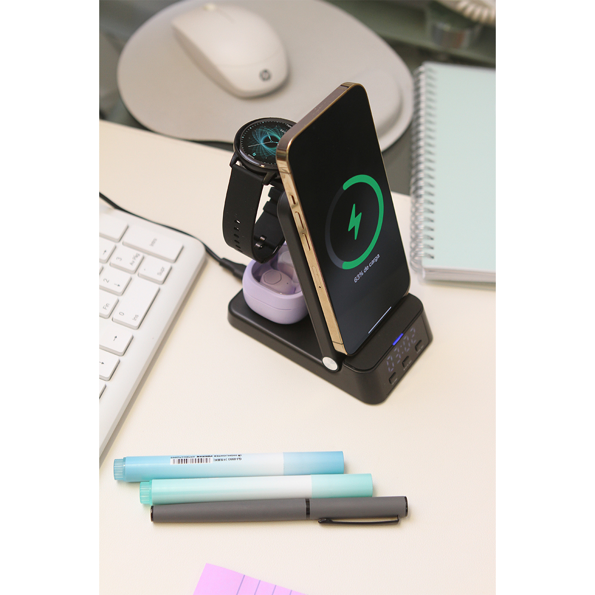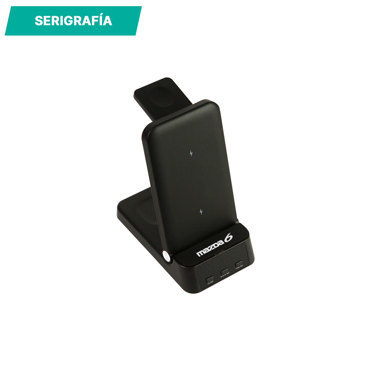Cargador Lidano. - Cargador inalámbrico multifunción con reloj. Cuenta con zonas de carga para teléfono celular, reloj inteligente y audífonos inalámbricos. Potencia máxima de 15W. Incluye función de reloj despertador.