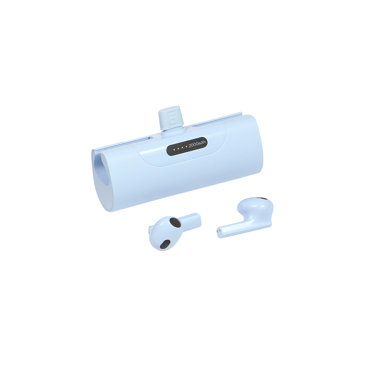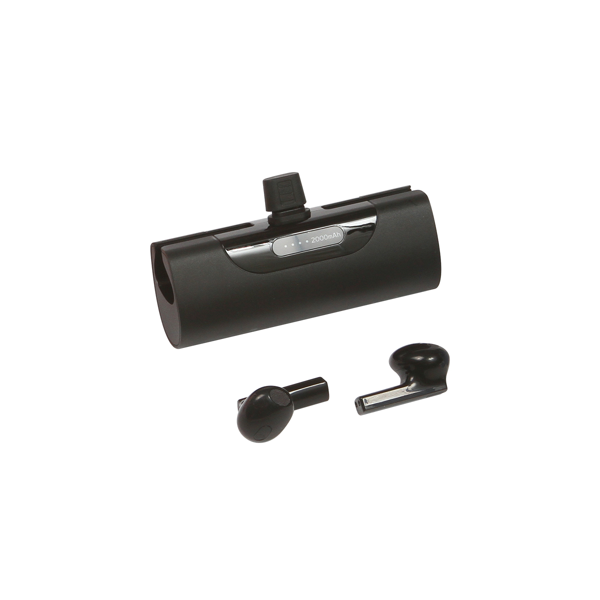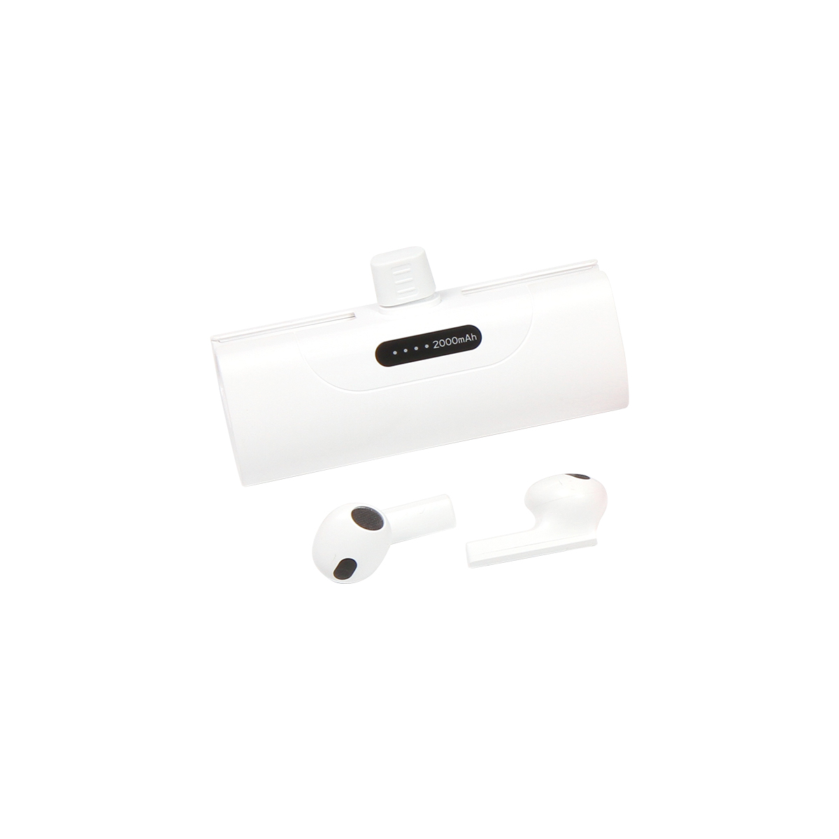Audífonos inalámbricos Sens. - Audífonos inalámbricos con power bank fabricados en plástico ABS batería principal 1,300 mAh y batería de los audífonos 25 mAh. Tiempo de carga de los audífonos 1 hora, tiempo de reproducción a volumen medio de 3 a 4 horas. Distancia de transmisión libre de obstáculos 10 metros aproximadamente. Puerto de carga tipo C.