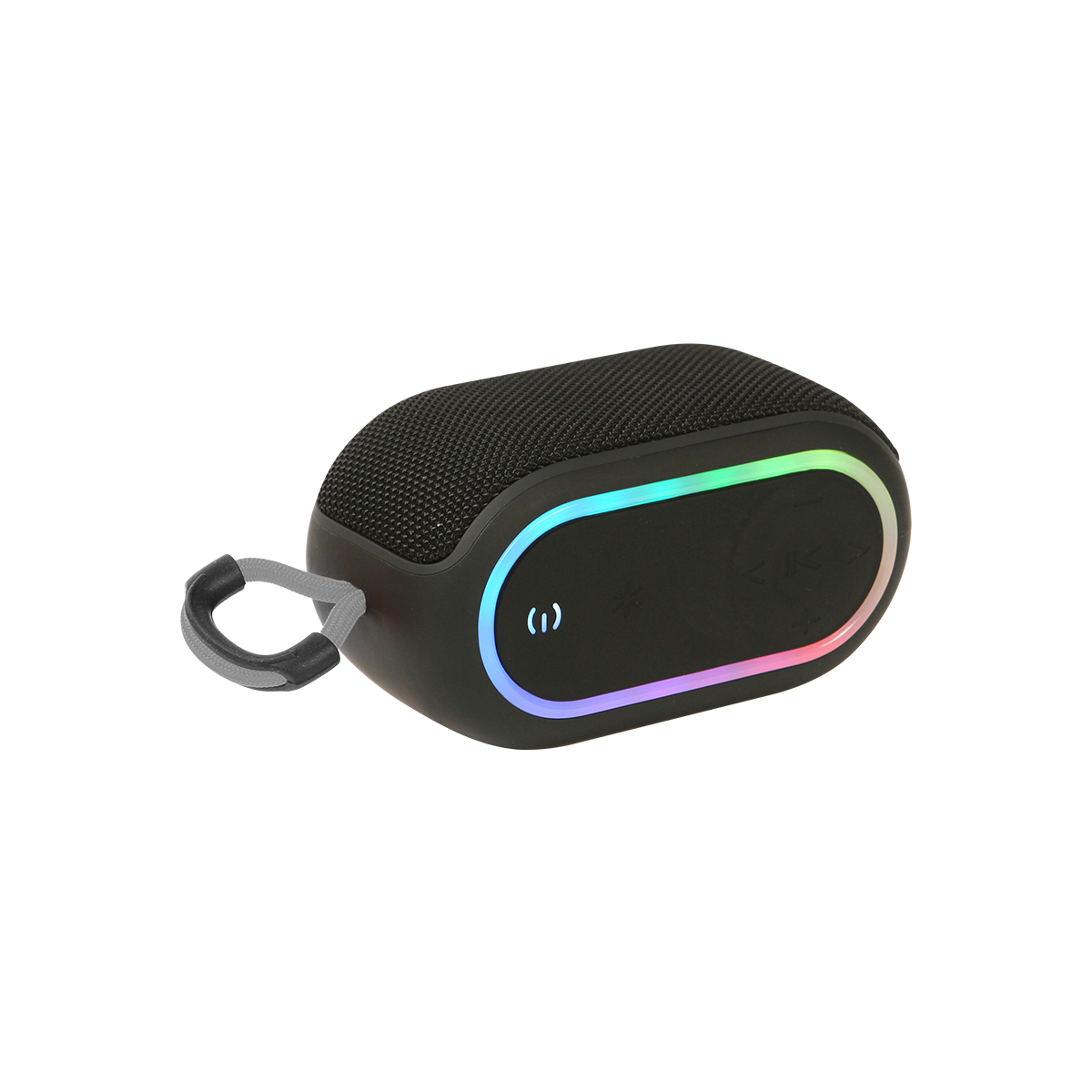 Bocina Camberley. - Bocina con conexión inalámbrica con radio FM. Cuenta con efectos de luces de colores, tiempo de reproducción de hasta 6 horas continuas a volumen medio, con un tiempo de carga de 2 horas con entrada tipo C, diseño adecuado para un modelo portátil. Cuenta con una entrada auxiliar, USB, TWS, tarjeta micro SD, FM, recepción de llamadas y asistente de voz. Su alcance de funcionamiento inalámbrico es de hasta 10 metros sin obstáculos. Cuenta con tecnología TWS, la cual permite emparejar dos dispositivos del mismo modelo, lo que significa que puede transmitir el canal izquierdo y el canal derecho por separado en cada dispositivo.