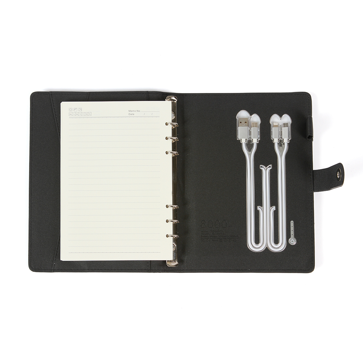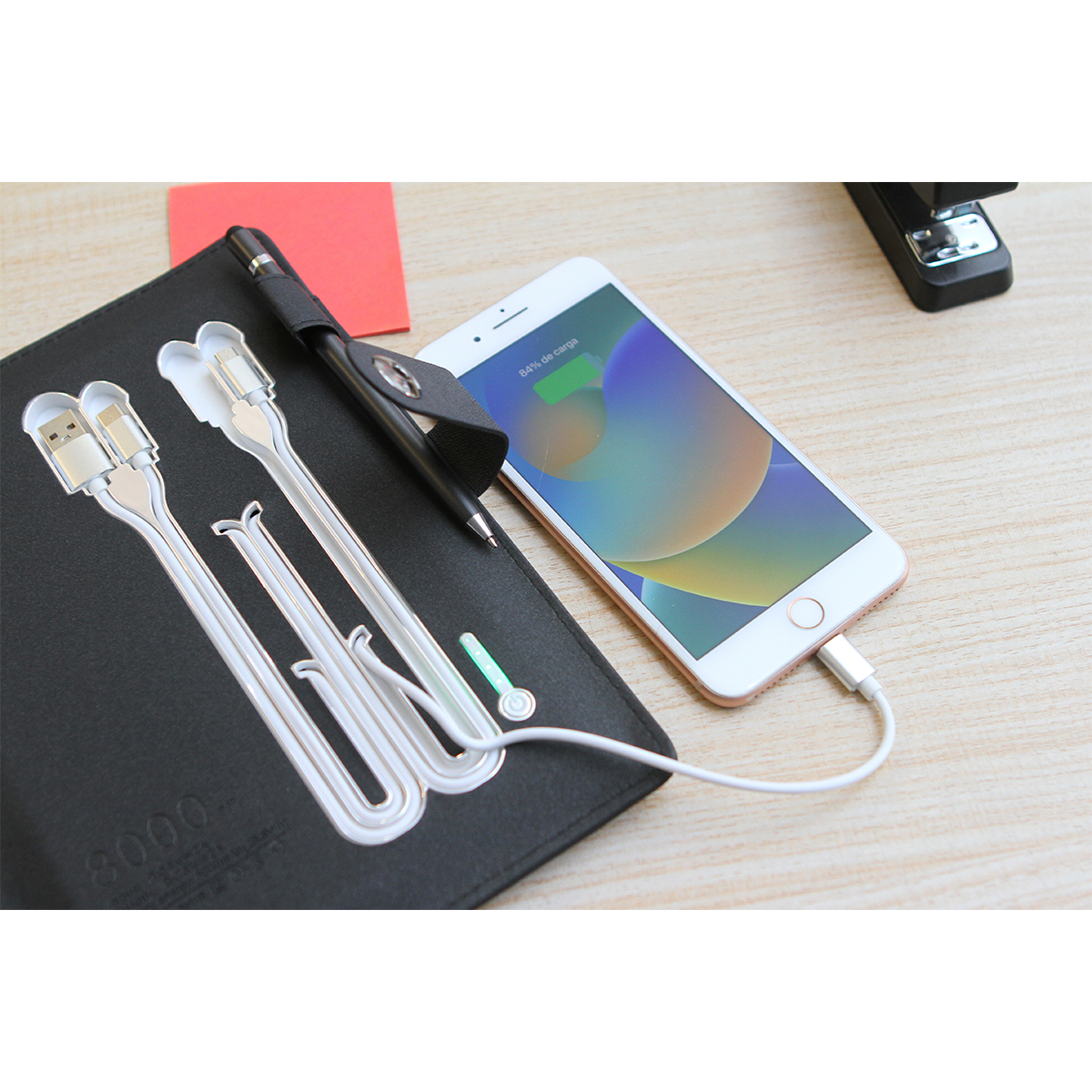 Libreta Chablis. - Libreta con cargador inalámbrico y power bank de 8,000 mAh, con compartimentos para almacenaje, porta bolígrafos, porta tarjetas y sujetadores de cables. La libreta cuenta con 90 hojas de 100g.