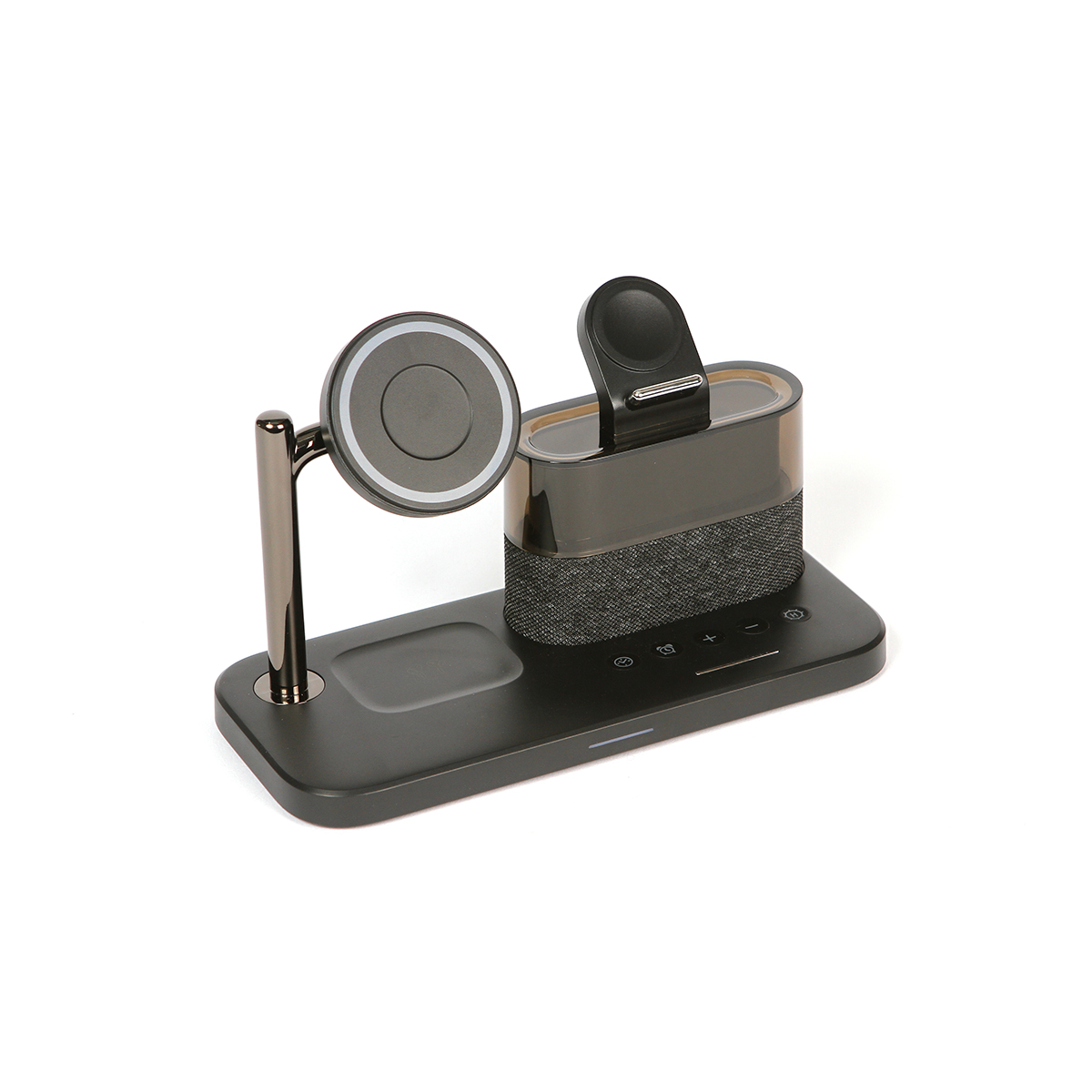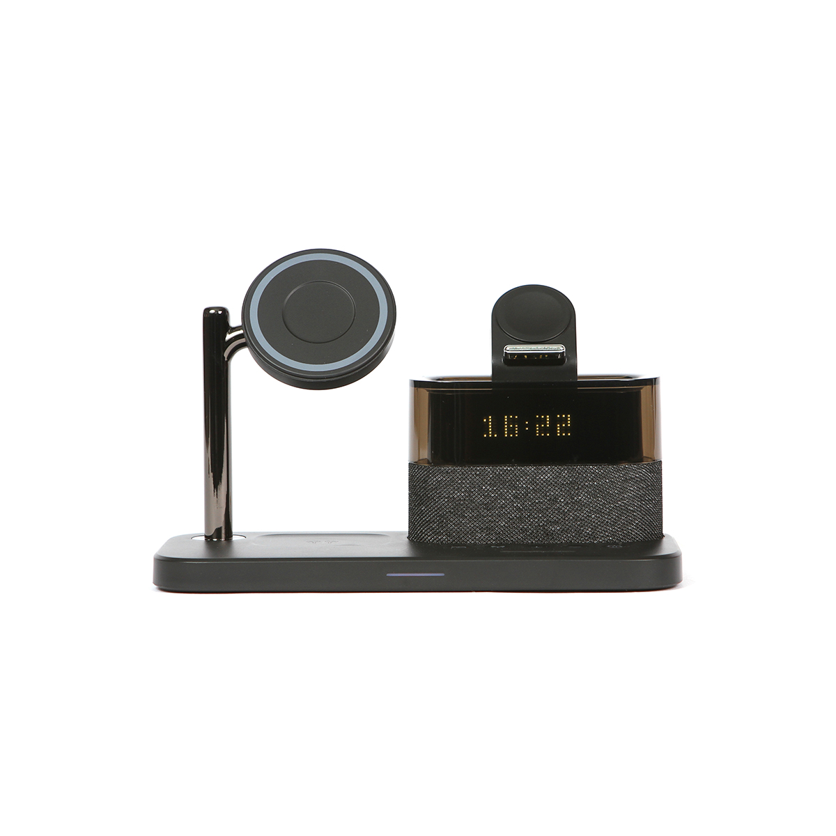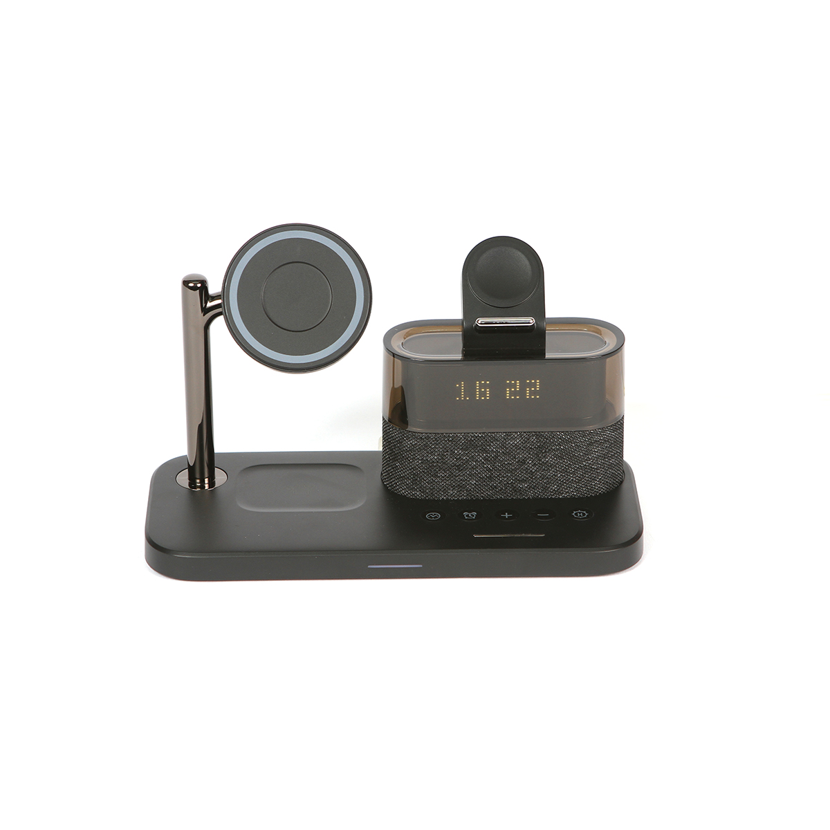 Cargador Provins. - Cargador con imán multifuncional para teléfono celular y audífonos inalámbricos. Con reloj y función de alarmas, incluye una lámpara de lectura. Diseño ergonómico especializado para escritorio y/o buró.