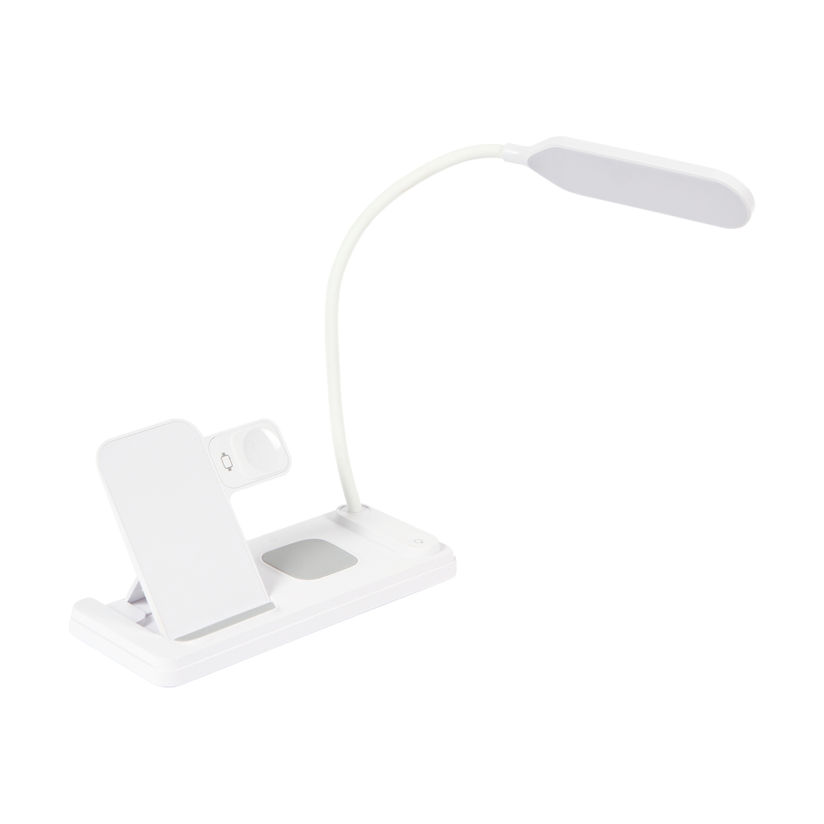 Cargador inalámbrico Sancerre. - Cargador inalámbrico multifuncional para teléfono celular, audífonos y reloj inteligentes. Con reloj y función de alarmas, incluye una lámpara ajustable con tres niveles de luz, blanca, cálida y neutra. Diseño ergonómico especializado para escritorio y/o buró. Producto innovador con diseño elegante.