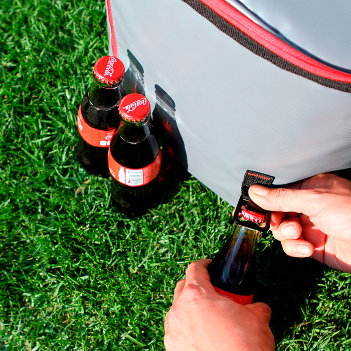Hielera Lira. - Hielera fabricada en PVC (lona) con destapador y compartimiento en el lado frontal, con correa ajustable y retirable, con asas en los costados para mayor comodidad al momento de transportar, cuenta con detalles de color en los cierres.
