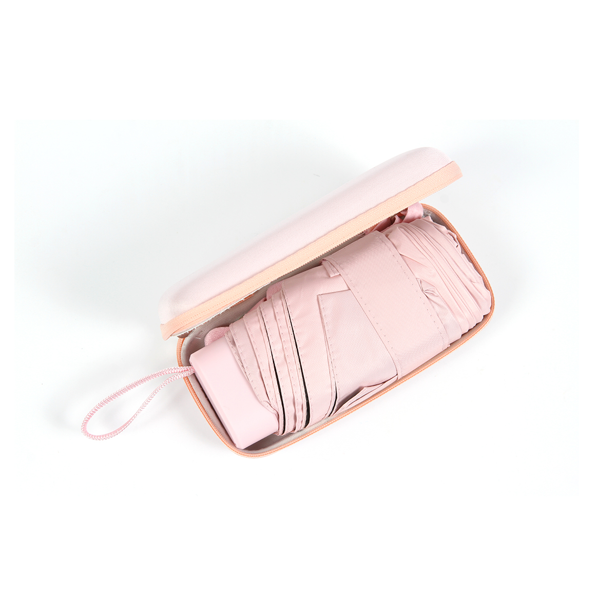 Paraguas Bahla. - Paraguas de bolsillo, fabricado en 210T pongee, con poliuretano negro, montura y puño fabricados en ABS; con seis varillas. Incluye estuche fabricado en etilvinilacetato (EVA).