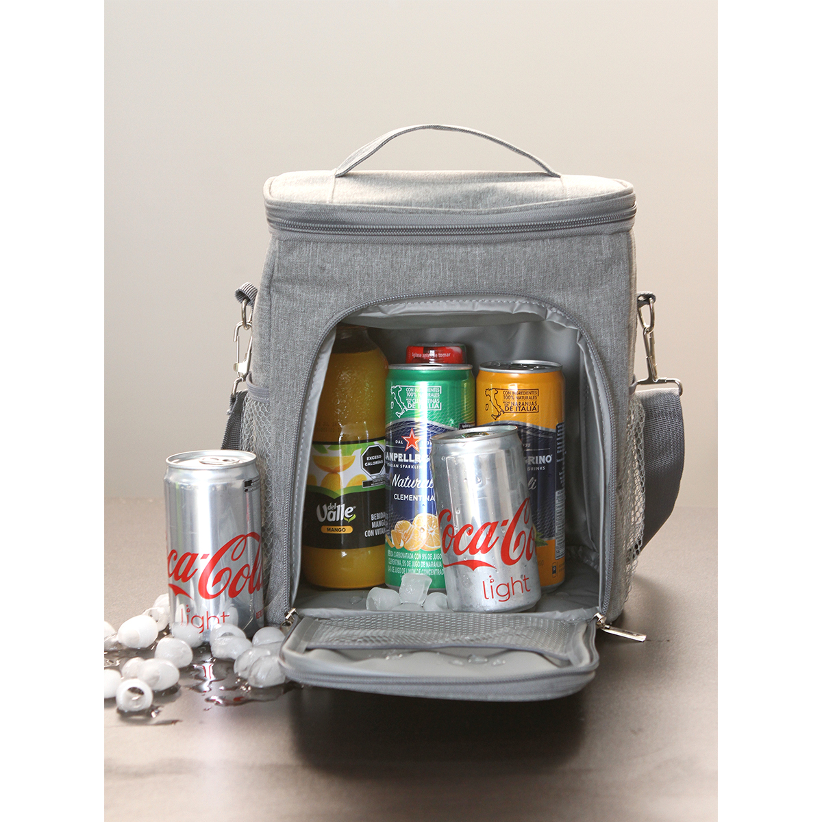 Hielera Kramfors. - Hielera fabricada en lona, espuma de PE, forro de acetato de vinilo y polietileno (PEVA). Cuenta con doble cierre, bolsas laterales tipo red, asa y correa de hombro.
