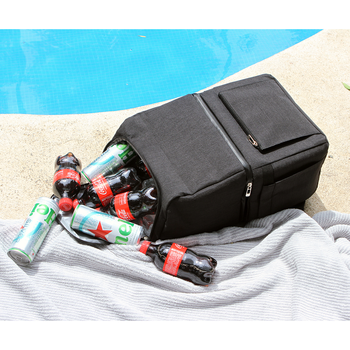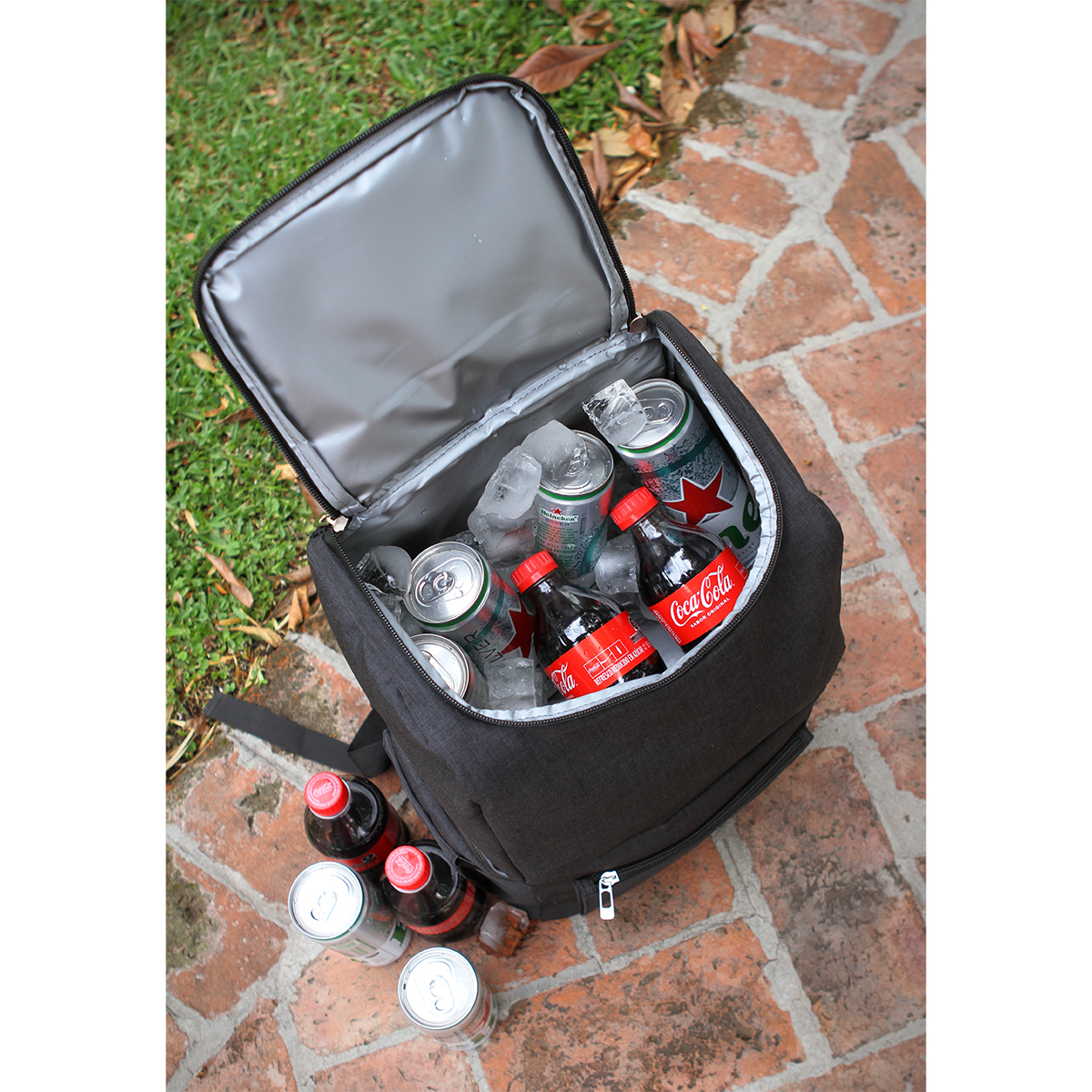 Hielera Quibala. - Hielera tipo backpack fabricada en poliéster. Incluye: Bolsillo frontal con cremallera. Dos bolsillos laterales abiertos con banda elástica. Bolsillo principal con cremallera. Forro interior de PEVA impermeable. Un bolsillo con cremallera en la parte superior. Parte trasera de malla sándwich. Un abridor de botellas en la correa trasera.