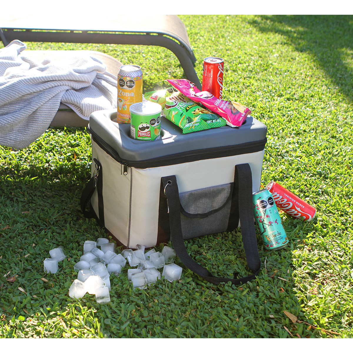 Hielera Maucini. - Hielera para alimentos fabricada en poliéster, nylon y eva. Cuenta con destapador metálico, correas ajustables para su fácil y mejor transportación. Además en la parte superior de la tapa cuenta con cuatro espacios fabricados en EVA para colocar bebidas, este material le da más firmeza para evitar que se derramen los líquidos.