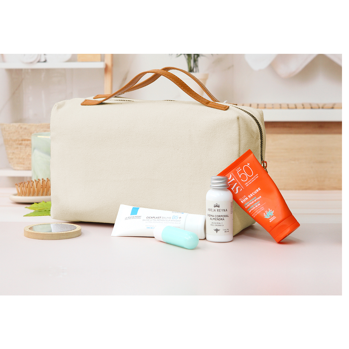 Bolsa Burdeos. - Bolsa tipo cosmetiquera fabricada en algodón tipo canvas caracterizado por su resistencia. Tiene un forro 100% poliéster con un compartimento principal con cierre, dos asas, con detalles fabricados en PU, también conocido como curpiel. Es un accesorio práctico y elegante que ayuda a organizar y transportar los productos de belleza de manera cómoda y segura.