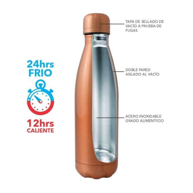 Ánfora Stahl / Ánfora Stahl Colors Termo con forma de botella que mantendrá tu bebida fría durante 24 horas o caliente durante 12 horas. Acabados mate y de alto brillo. Hecho de acero inoxidable con doble pared. Tapón con sellado de vacío que mantiene fresco el líquido que contenga y evita al 100% cualquier derrame. Se entrega en caja de cartón individual. Capacidad: 500 ml. Lavar antes de usar.