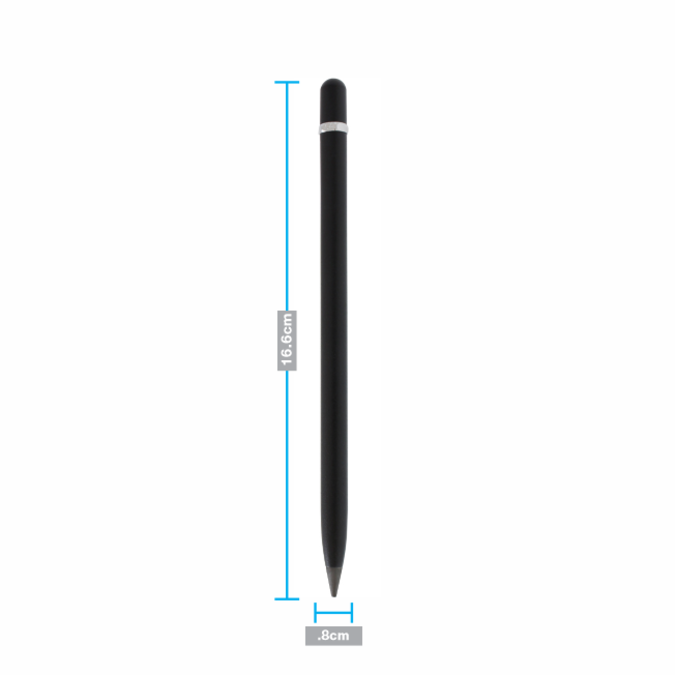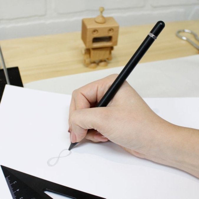 Infinity (Inkless) Bolígrafo ecológico que escribe sin tinta, por lo que nunca se termina. Disponible en acero, y negro mate con acabado rock (Texturizado y súper resistente). El trazo gris simula la línea de un lápiz. No deja manchas y es posible borrarlo con una goma regular. Incluye estuche individual.