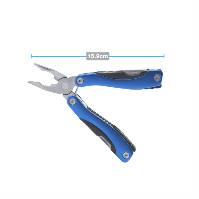Pinzas Dansk Multi herramienta 9 en 1: Pinza de uso general, en cuyos mangos encontramos un par de navajas de diferente tamaño y forma, desarmadores (cruz y plano), abre latas y lima de uñas. Fabricada de acero inoxidable con terminados de aluminio en los mangos. Es plegable para su fácil transportación. Incluye estuche individual.