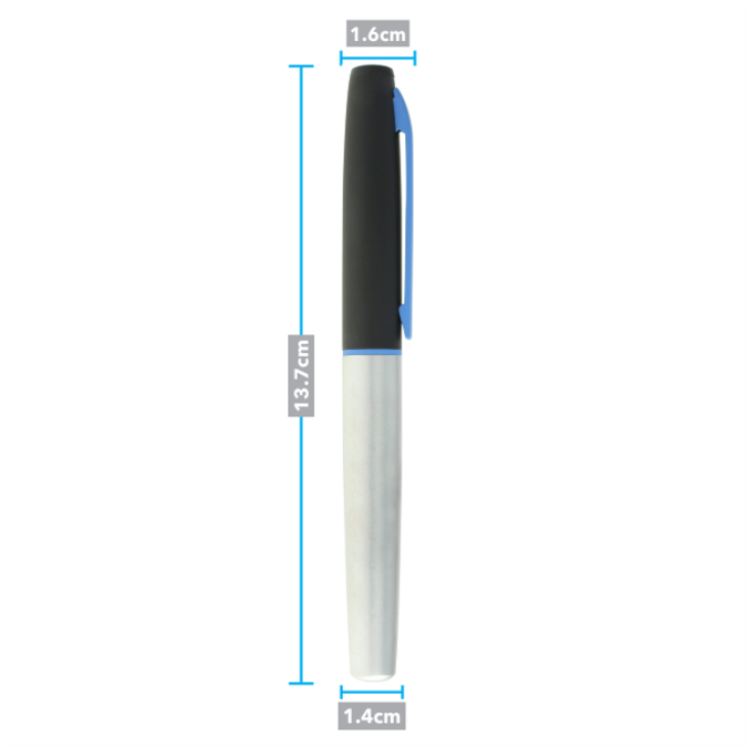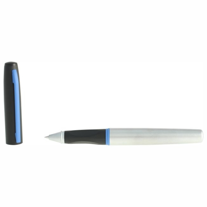 Tecno Bolígrafo metálico con tapón que cierra a presión. Cuerpo color plata y tapón negro con detalles rojos o azules. Escritura de alto desempeño debido a su repuesto japonés tipo roller (a elegir entre tinta negra o azul). Incluye estuche individual.
